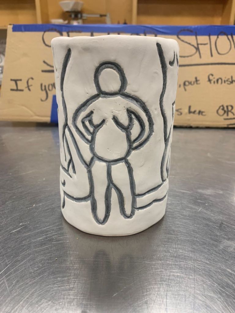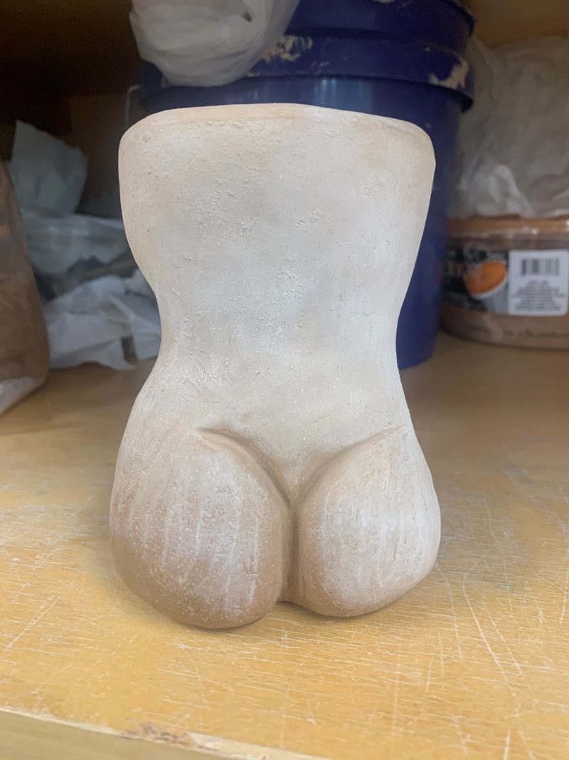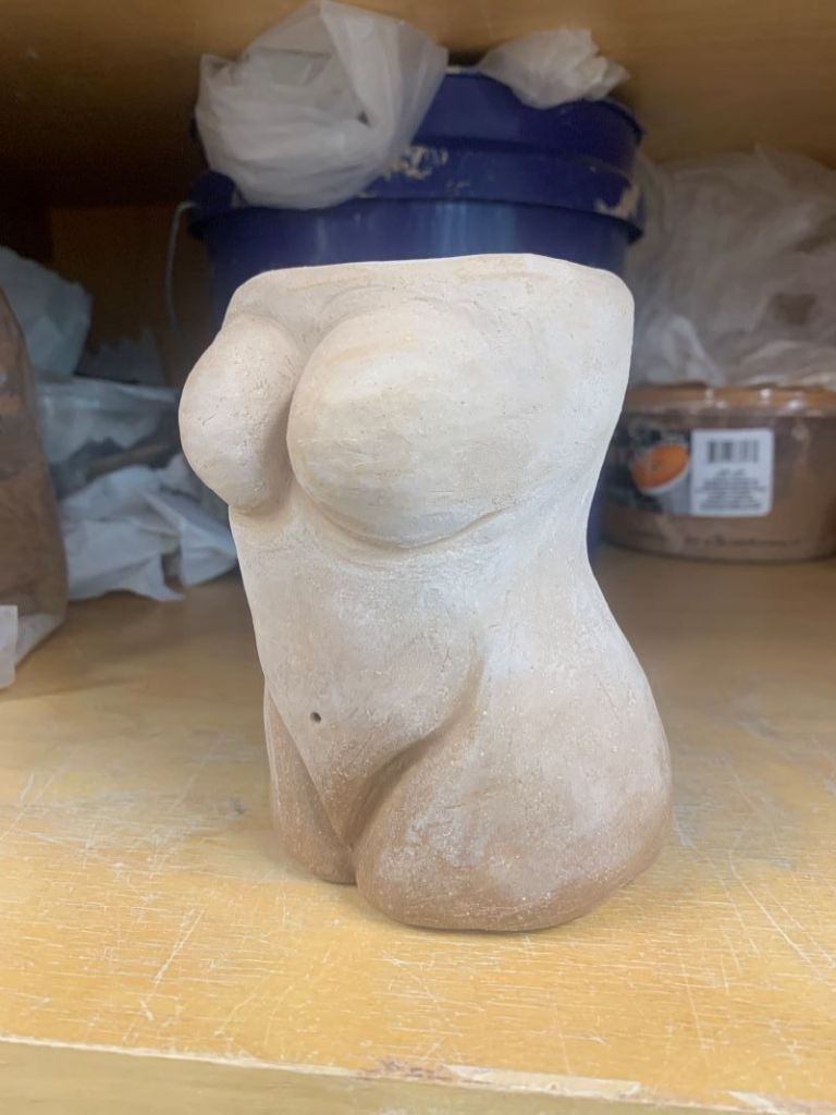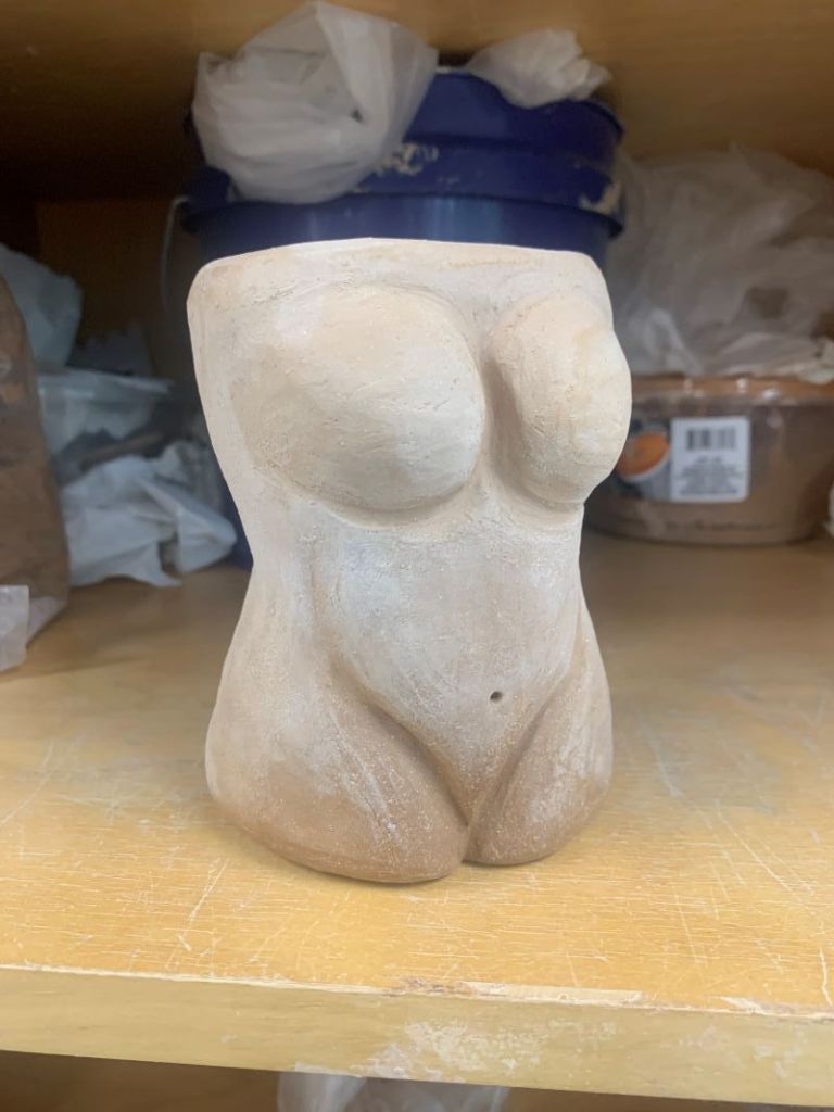 The middle of the semester is here and it is time for me to start getting all of my artwork together for my fall senior exhibition. It has definitely been a stressful time for me, making sure I have enough pieces, getting them done in time, figuring out titles and all of the specific details needed. I believe that I have almost everything prepared except for my female torso figure. Unfortunately, this piece has not dried in time to be bisque fired so I cannot put it in the show. I accidentally made the bottom thicker than the top, so it has been drying unevenly. As you can see in the picture the bottom is darker than the top showing it isn’t completely dry yet. This is a bit disappointing because I really enjoyed making this piece but even if it can’t be in the show I am still excited to finish it and display it at home. The show opening is Saturday November eleventh, so maybe if I finish it this week or so I might be able to still slide it into the show, but we shall see. Either way I have enough pieces and even if the torso isn’t done in time, I believe it will still be really cool to see it finished.