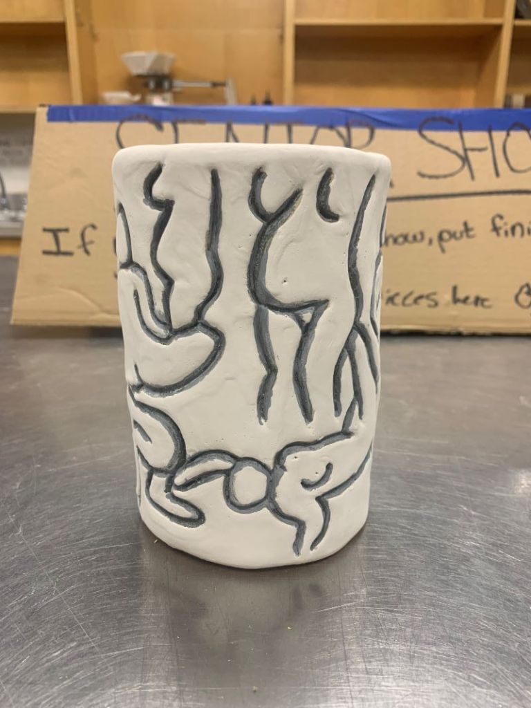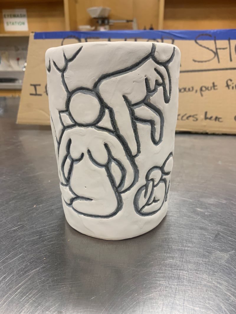 Other than the female torso, all that I have left to do is finish glazing all of my pieces. So far the only one that I have been able to glaze is my vase. My other ceramic pieces are currently in the kiln being bisque fired, so I will be going into the studio Tuesday to finish glazing those. For my vase I decided to paint the carvings with black glaze and I covered the rest of it with a gray. Right now the gray looks white but that is only because it has not been fired yet. For my mugs and coasters, I want to do a similar idea where I paint the carvings a color and the rest of the mug will probably be gray or white. My plan is to glaze each of them with different colors within the carvings. I have not yet decided what colors, but it is something I will be pondering over for the next few days.
