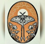 Her works consist of graphic design, logo design, but mainly it is linocut prints with themes tied to nature, fantasy and, the occult. Adrianne technical skill is demonstrated with her control of her cuts on the linoleum block. The lines are decisive, the imagery is clear, and composition is balanced. The prints are well rendered showing that Adrianne really cares about the end result of her efforts. Another reason I enjoy printmaking so much is it’s use of the element of design, Line. Line is my favorite element and you can accomplish so much with it like how Adrianne uses line to visually explain movement, gradation, variety.