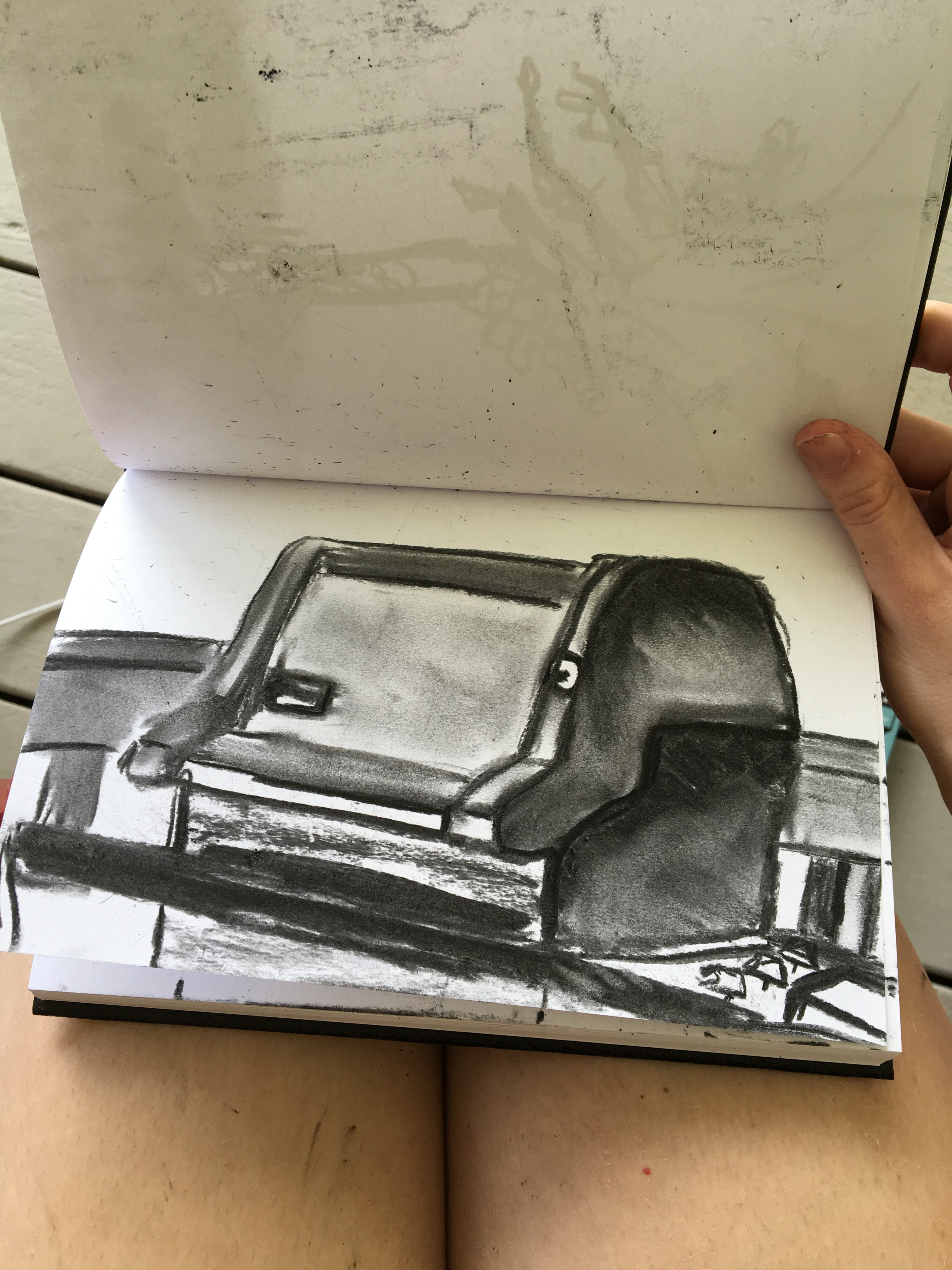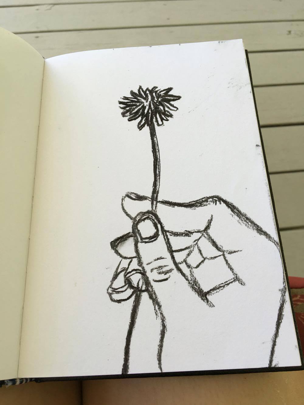 So the other day I decided to sit outside on my porch with my sketchbook and drawing materials and just draw. I ending up using charcoal to draw with since I haven’t used it recently. I did a couple five minute drawings from life with the charcoal. They were just really quick sketches; one of my dog who was sprawled out in one of the chairs on our porch, a dandelion flower that I found in the grass, and another of our barbecue grill. The drawings are not highly detailed or finished. Some are more so just line drawings, but I do like the texture that I was able to create with the charcoal in some of them.