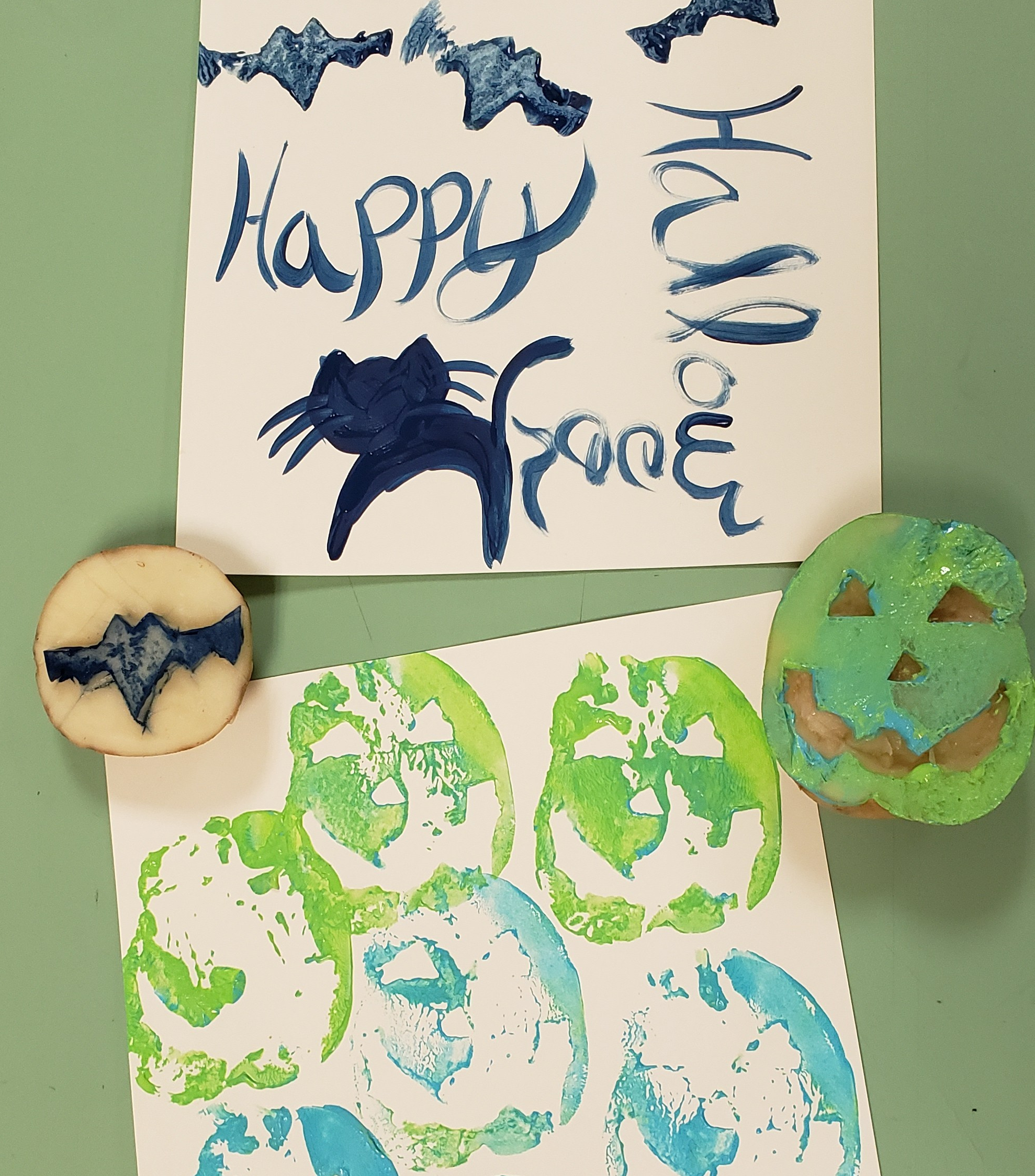 In order to make the prints we cut a potato in half and carved out the design on it. We painted the pumpkins and pressed them down on a piece of paper.