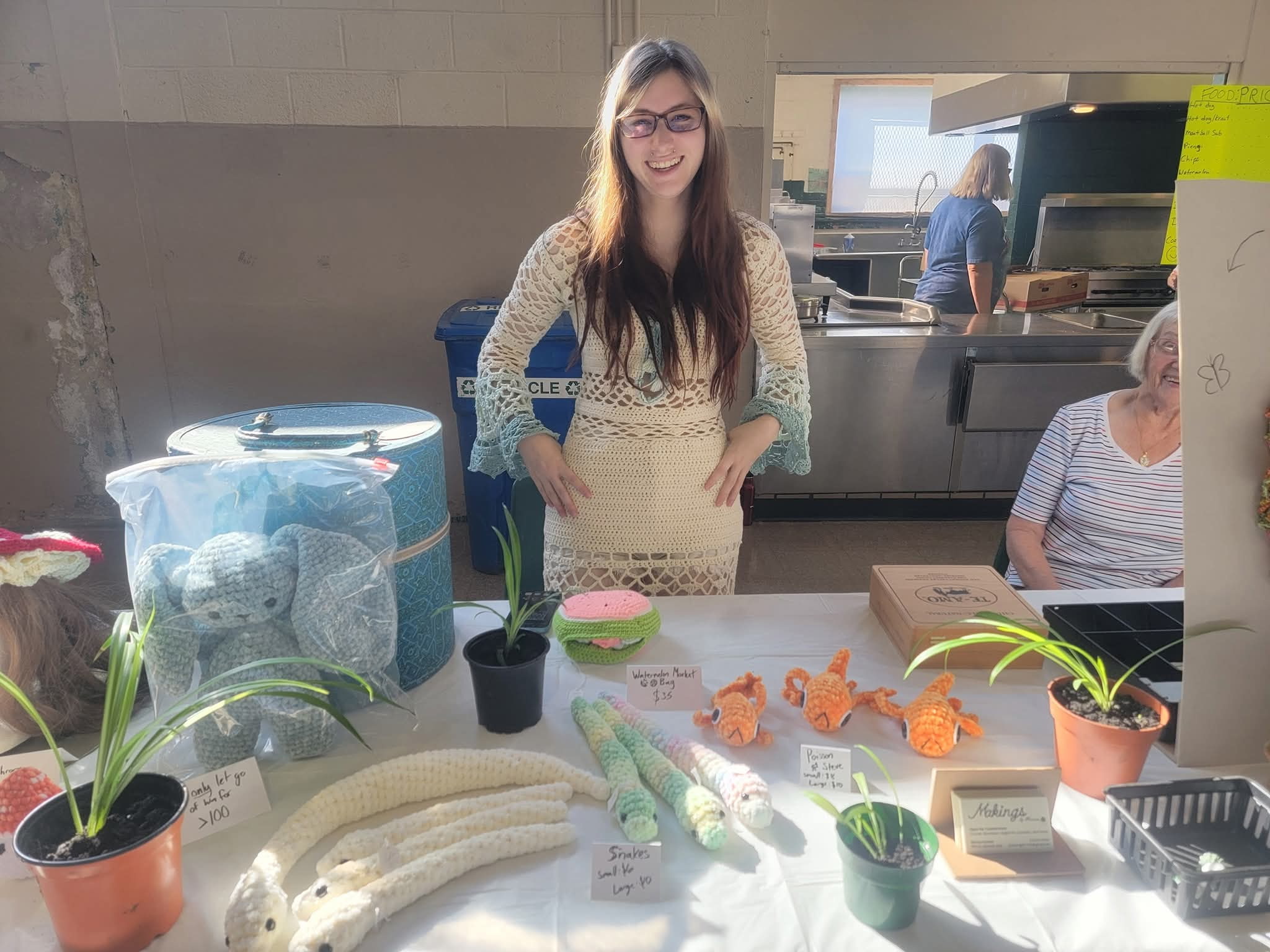 Now that I had made one sale, I felt a bit more optimistic but worried that maybe people would only buy plants and I might not sell a single crochet piece. Spoiler alert: I didn’t sell another plant the entire rest of the time. A lady came by a few times. I waved at her the first two but the third time we struck up a conversation and she bought one of my little snakes. My dad popped in around this point and snatched up two of my ceramics. My brother bought a crochet item as well. Those sales don’t count as much, though. The next sale came from a teen girl. She bought another snake.