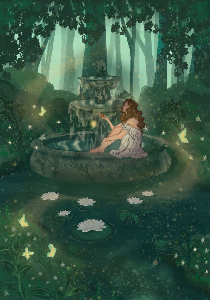 This illustration, which I titled The Wishing Well, was the first and main piece in my SI. My goal for this work was to convey the idea of “wishing for a change”. I tried to jam-pack as much symbolism into the illustration, such as the lilies and the butterflies. Looking back at it, there’s a lot that could’ve been better. The composition is flat, the values are similar, and the overall piece looks dull and depressing.