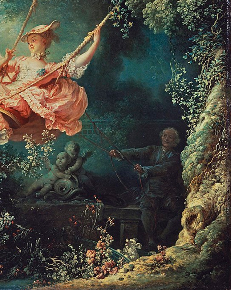The young woman has a very mischievous facial expression as well as body language. There is an angelic statue in the painting on the left that appears to be “shushing” over the garden, meaning to keep the secret of the young lovers meeting. The small dog dog barking near the innocent older man references fertility which is ironic being that the dog is barking giving away the lovers secret meeting. The even further the theme of love the artist depicted a statue of two baby cupids below the young woman to indicate being struck with love.