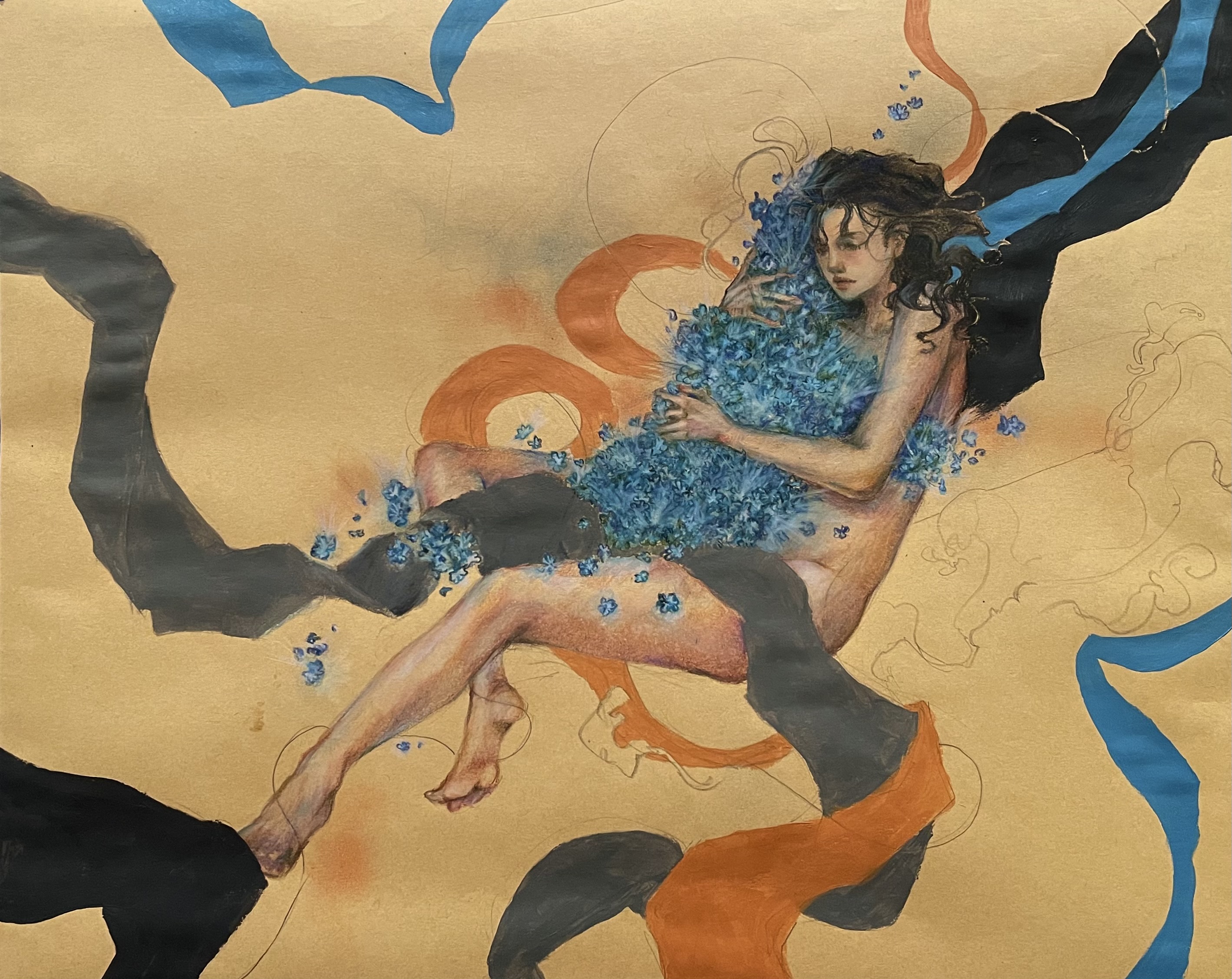 To bring the flowers and figures as one, in harmony through colors, I reflected the colors of each onto another. The blues of the flowers leak into the flesh, and the peach hue finds its way into the flowers. Although I kept the reflective colors at a minimum, I hope they still make the two separate subjects come together as one.