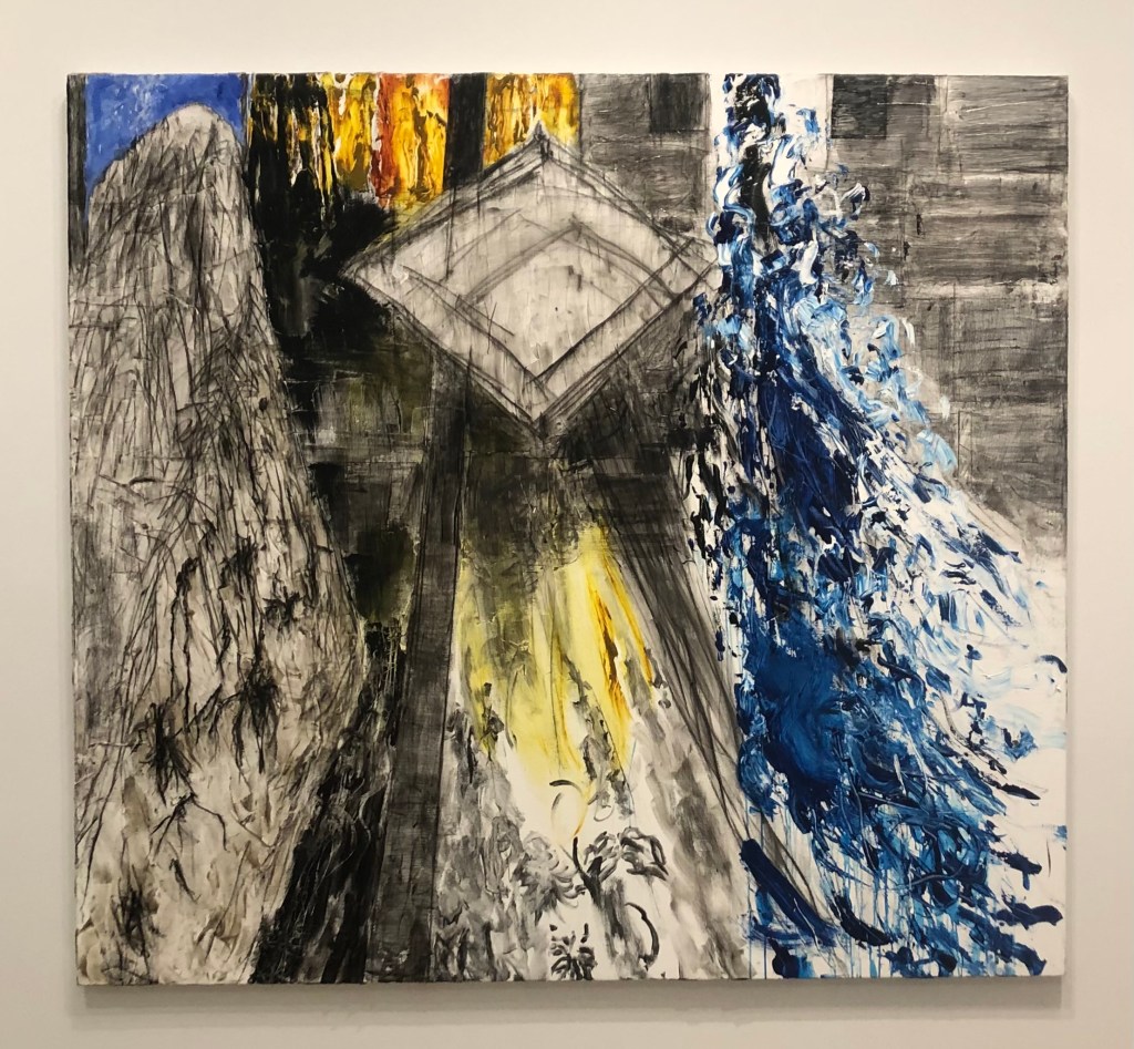 Other paintings proved more difficult to define. This painting, Sammy’s Beach I, features a large diamond shape that draws your eye to it. I wondered if it was a boat, but this seemed unlikely because the water appears to be to the right of it. I eventually landed on it being a dock for boats to come and go. Maybe I shouldn’t try to define what it is, since that isn’t what Fox intended, but I think it’s more fun to find imagery in abstract pieces. It forces you took look closer, appreciating every mark, stroke, and splash of color. It encourages you to talk about what you see and have conversations about it, which is one of the most important things for an artist to be able to do.