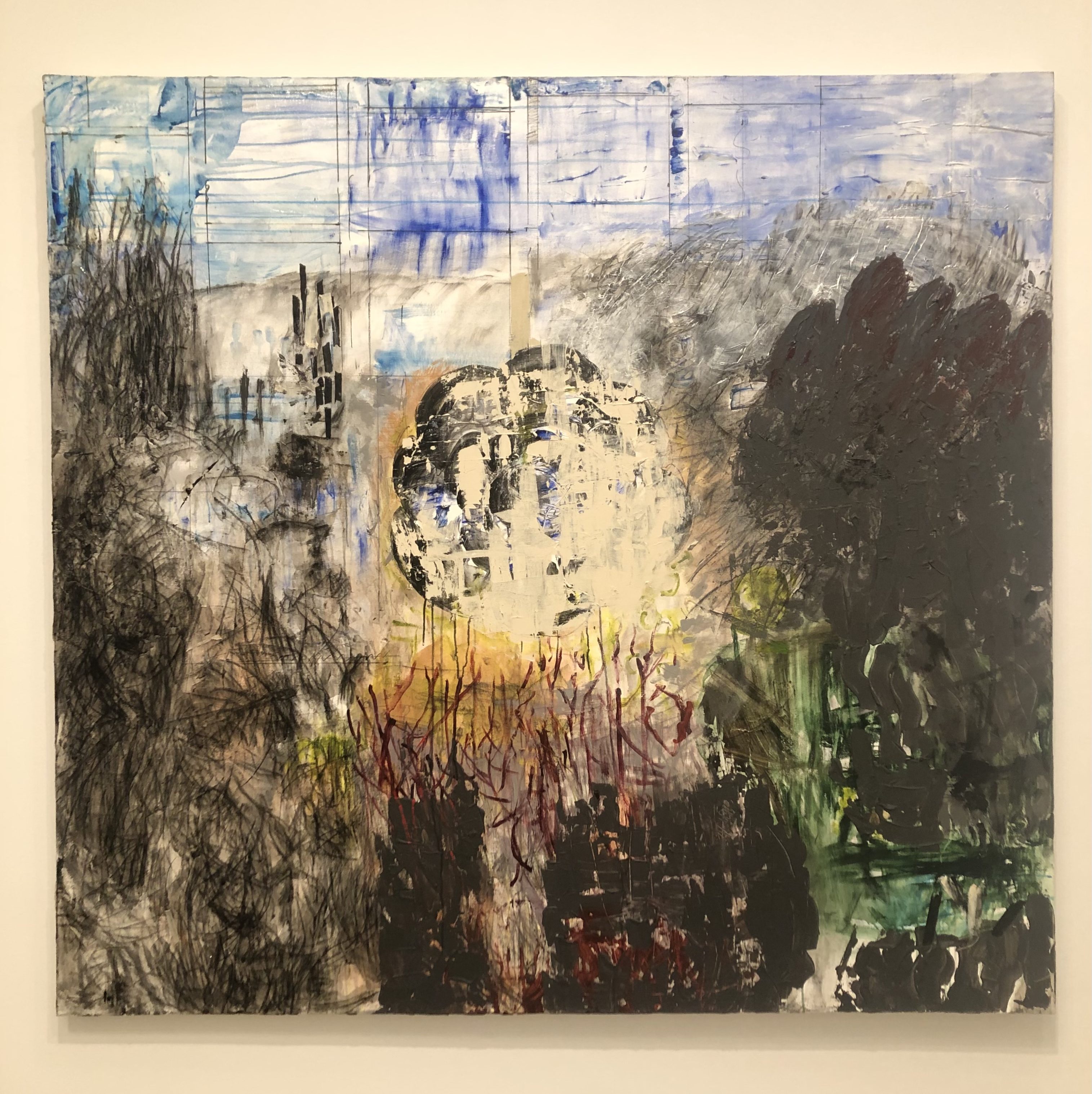 Although Fox claims that her paintings are not of landscapes but of memories and observations, I couldn’t help myself from looking for signs of a landscape in each painting. In this piece, Sammy’s Beach VIII, I found tall grass in the dark shapes of the foreground with the sand and ocean beyond them. I think the shape in the middle may be a seashell, but it could be a flower too. I especially love the top of this painting, where Fox allowed some of the paint to drip and pool, while, once again, having the grid shine through. It reminds me of a painting I once did in high school, where my teacher told me to leave the organic shapes the paint had made. I wasn’t sure at first. I had always preferred to “follow the rules” with art, but that piece taught me that there are no rules, so I should just take a risk. I think this helped me to truly appreciate Fox’s work – I see where she took risks, and they are truly amazing.