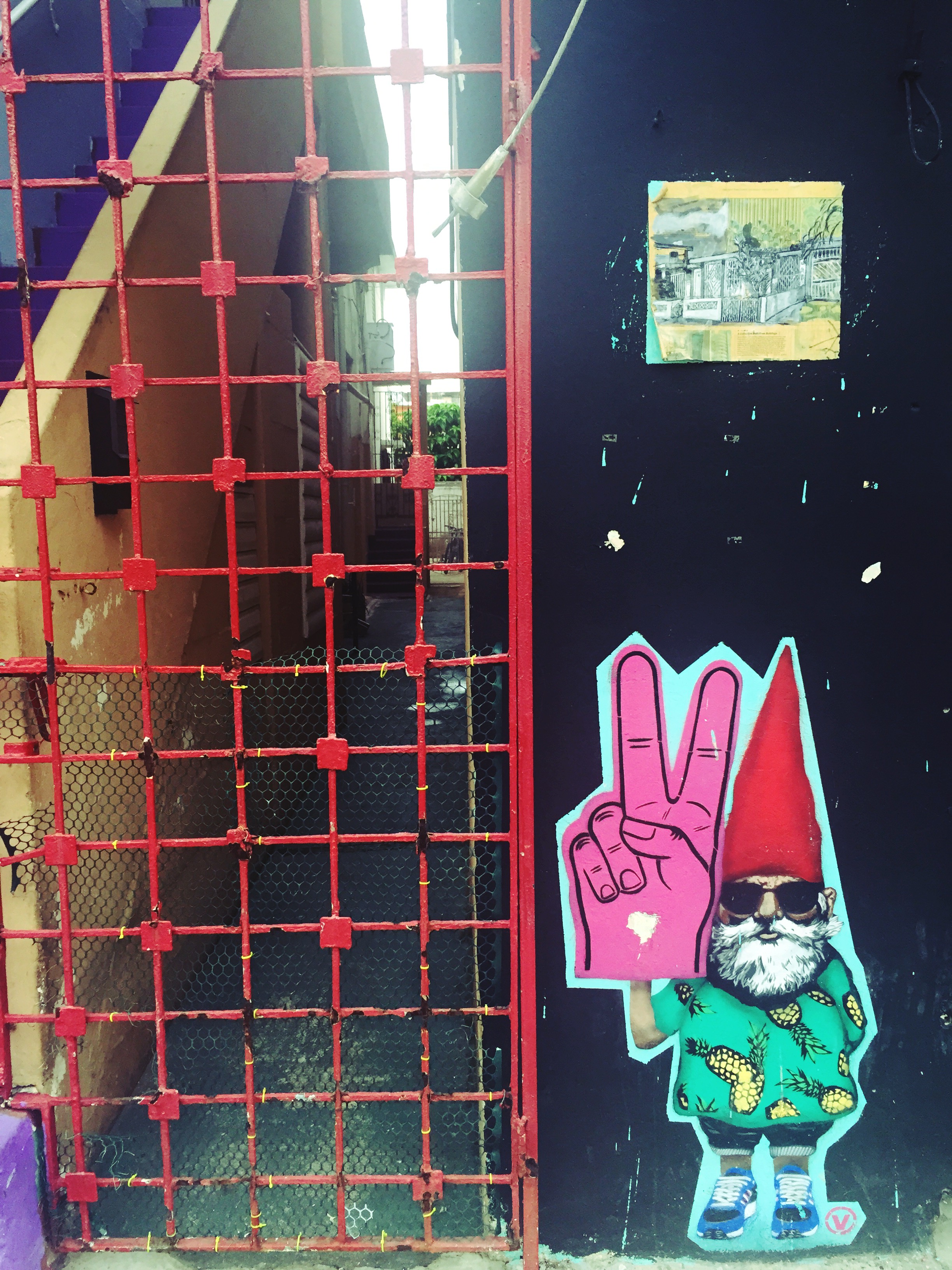 Jonathan told us a bit about the artists – some of them he knew, some he didn’t. One mural was done by Puerto Rico’s most famous tattoo artist. Another worked on pieces that demonstrated political issues, using street art as an outlet for himself and as a form of communication for his followers/fans. The street artists of Santurce give the people of the neighborhood something to look forward to each and every morning. Who knows when the next new mural might appear? One day you’re walking to your car and are greeting by gnomes on the sidewalk. The next week, on that same walk to your car, you might be greeted by mermaids.