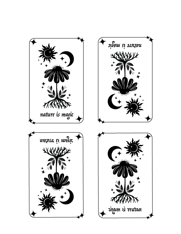 For my print, I decided to go the nature route of magic. I think that nature is so fascinating and how things grow and evolve seems like magic to me. So I started on Illustrator to create a black and white graphic I could photo emulsify onto a screen. I wanted it to have a whimsical feel because that also gives me magic vibes, so I started drawing a flower with roots coming out of the bottom, with a moon, sun, and some stars around it as well. I thought that represented the process of a flower growing, along with some other elements of nature that seem like magic to me, like how the sun, moon, and the stars are so bright and visible from Earth. Then I decided to give it a border, that sort of framed it like those Tarot reading cards you might have seen. That reflects magic to me as well so I thought it was perfect.