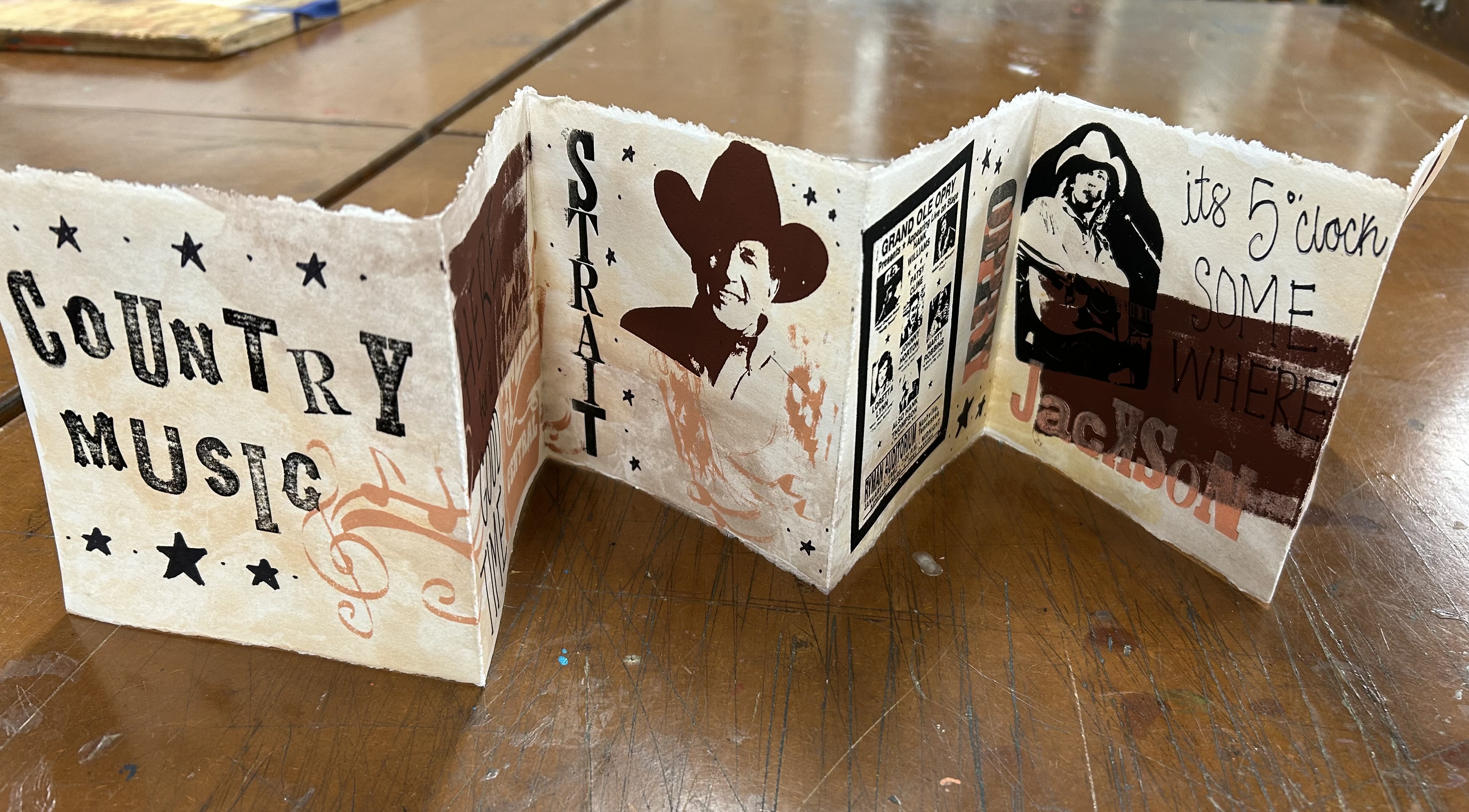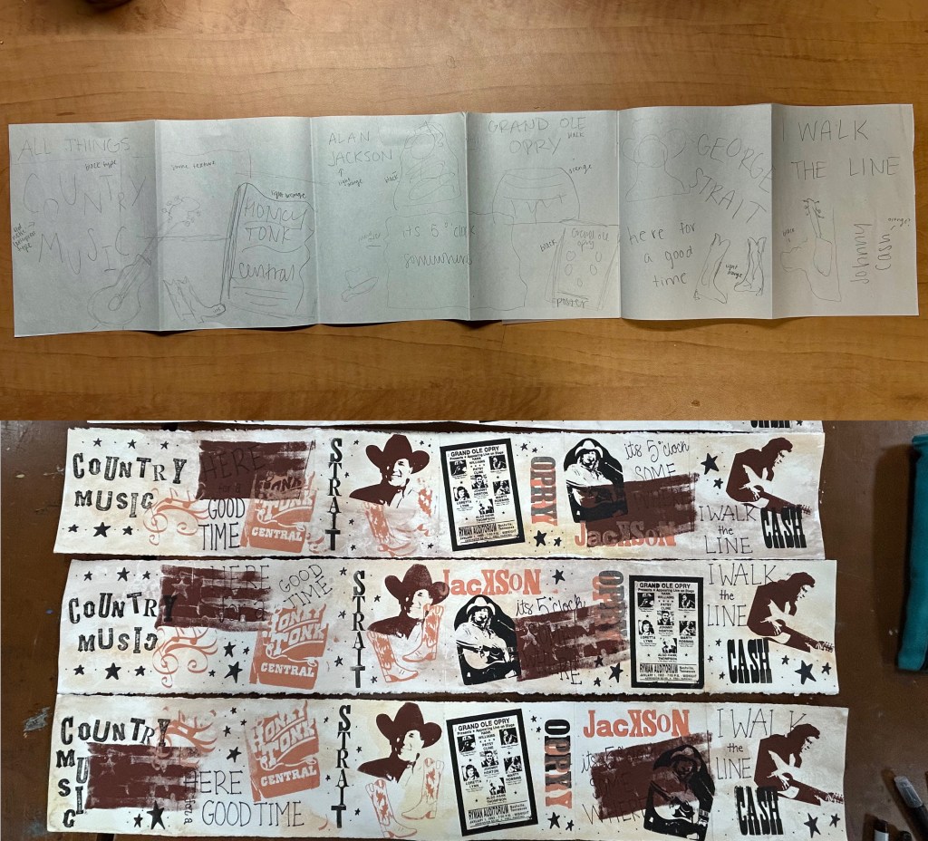 Hi Everyone! Hope the last few weeks of the fall 2025 semester are going good, can’t believe it’s already almost over! The last few weeks in the printmaking studio I have been working on an accordion book project for my Screen Printing class. It took a lot of planning and many small steps to get there, but I finally finished it and I am very happy with the product! The assignment was to create any sort of accordion booklet, any size, any amount of folds, and about anything you want using at least 2 different printmaking methods. For me, the first thing that came to my head was a booklet about country music of course, so that’s exactly what I did.