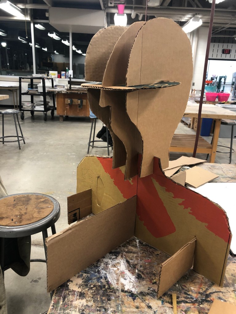 I initially started by taking measurements of myself in order to figure out just how big bust was going to need to be. I considered making a inner skeleton out of cardboard to support the chicken wire I would eventually wrap around it and build off of. I was not entirely pleased with the cardboard skeleton I had made, it was not sturdy enough.