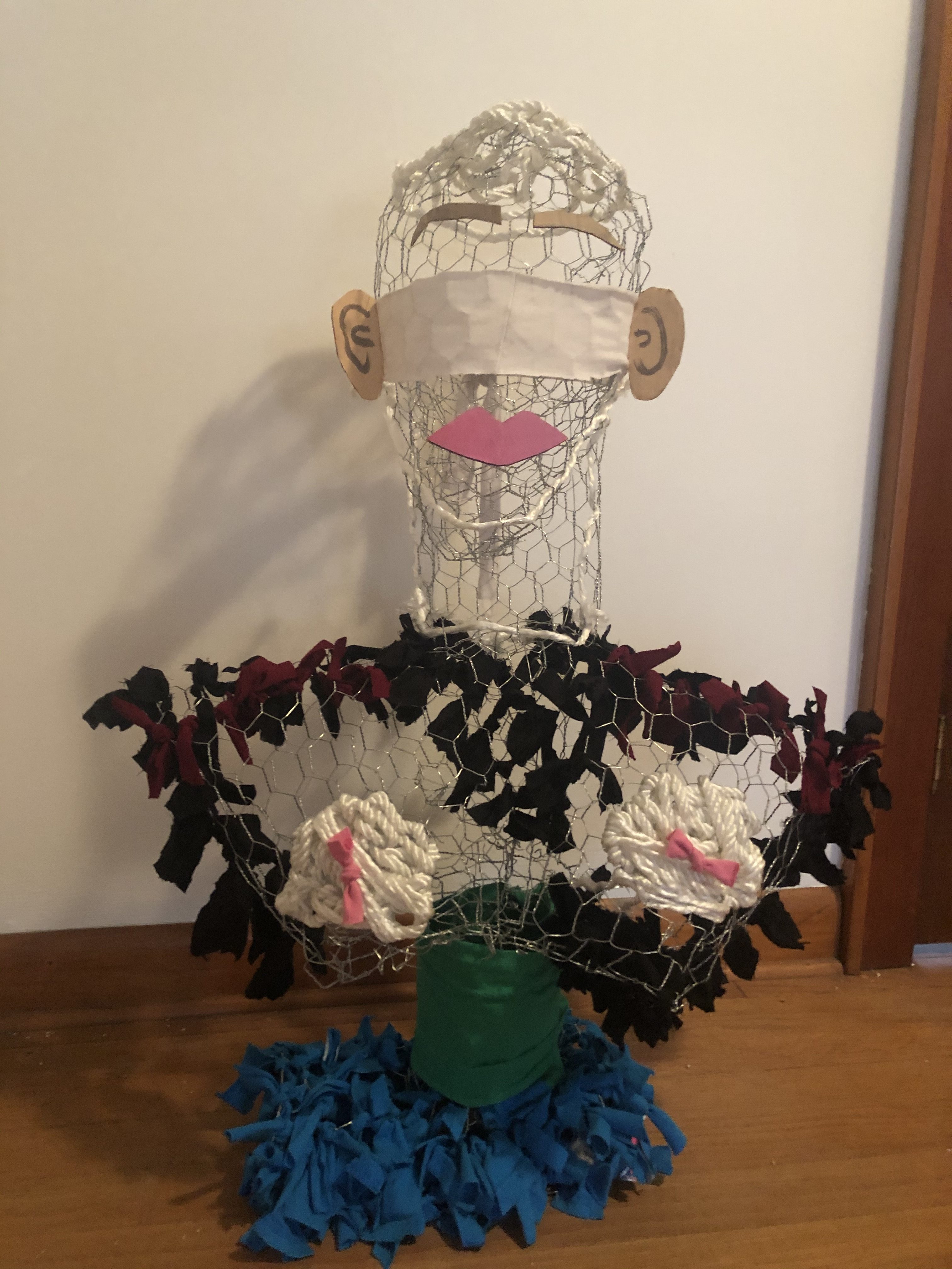 In previous projects I had worked with a white nylon rope material that I really enjoyed and I wanted to incorporate that somehow into my bust. I was able to weave this rope throughout the chicken wire and create a funky pattern within the rope. I liked the way the material was weaving through the chicken wire, so I decided to continue on with that type of technique. Although this time I was cutting up old articles of clothing and cutting it into strips to weave and attach to the chicken wire.
