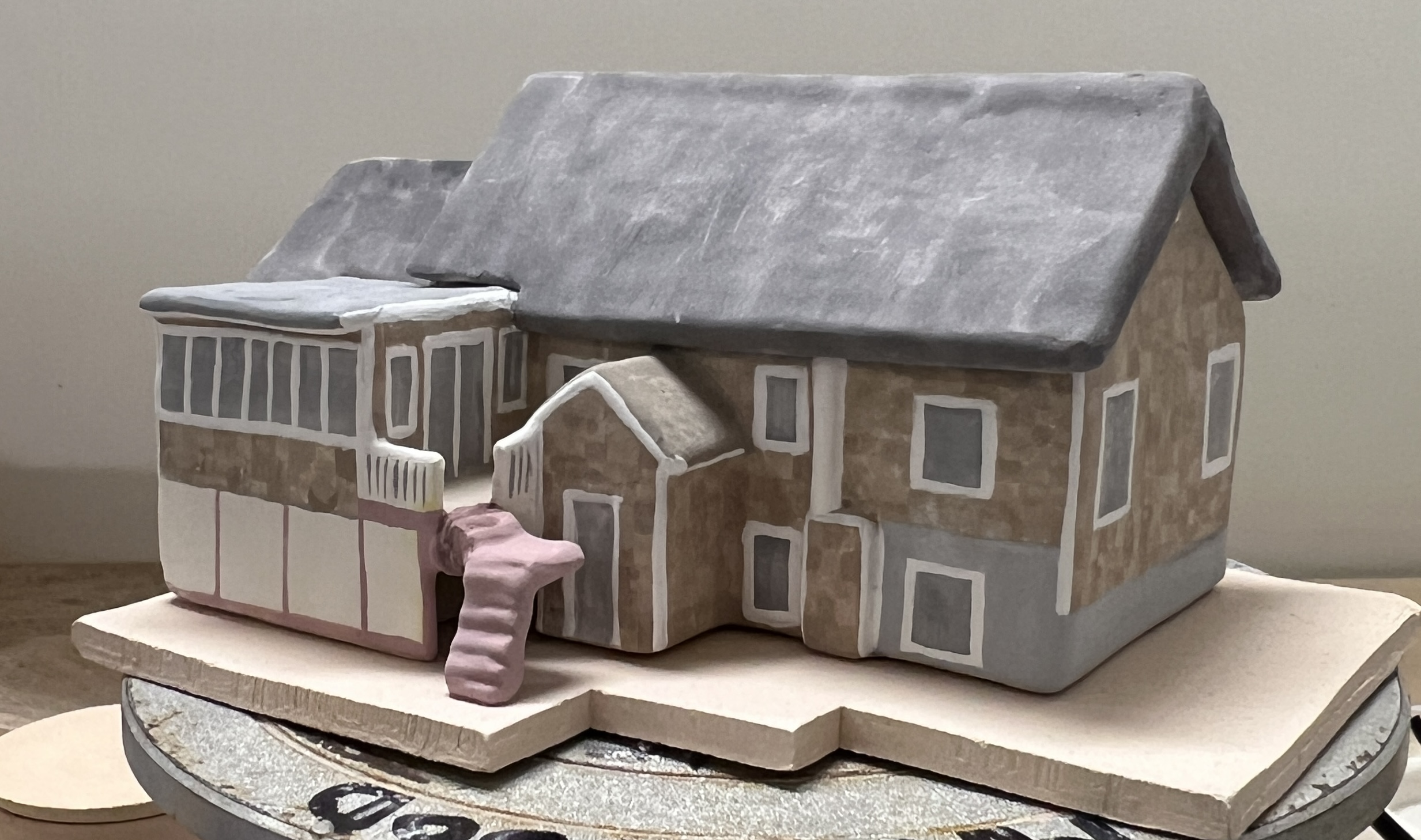 First, I finished glazing the house replica just in time for the final kiln firing! Before showing the final result, here’s a look at it pre-kiln. The semester’s end crept up on me, so I had just one day to finish glazing. Still, I’m happy with the result, and the time crunch helped me push through. I started with the siding, hand-painting each wood panel, and used the same textured approach for the roof, but with a single color. The windows and other details were challenging, but worth it. Attaching the stairs was tedious, and I managed it with white glaze and a paintbrush. That simple of an explanation doesn’t encapsulate how much of a pain it was, but I digress. Then, I had to leave it in the hands of the kiln! Here’s what it looked like before firing.