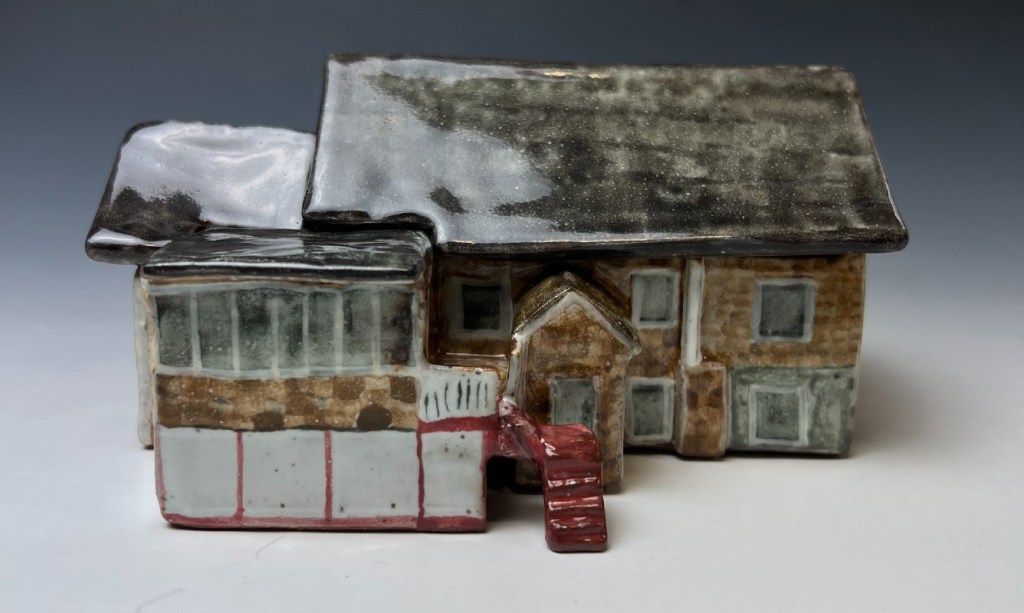 First, I finished glazing the house replica just in time for the final kiln firing! Before showing the final result, here’s a look at it pre-kiln. The semester’s end crept up on me, so I had just one day to finish glazing. Still, I’m happy with the result, and the time crunch helped me push through. I started with the siding, hand-painting each wood panel, and used the same textured approach for the roof, but with a single color. The windows and other details were challenging, but worth it. Attaching the stairs was tedious, and I managed it with white glaze and a paintbrush. That simple of an explanation doesn’t encapsulate how much of a pain it was, but I digress. Then, I had to leave it in the hands of the kiln! Here’s what it looked like before firing.