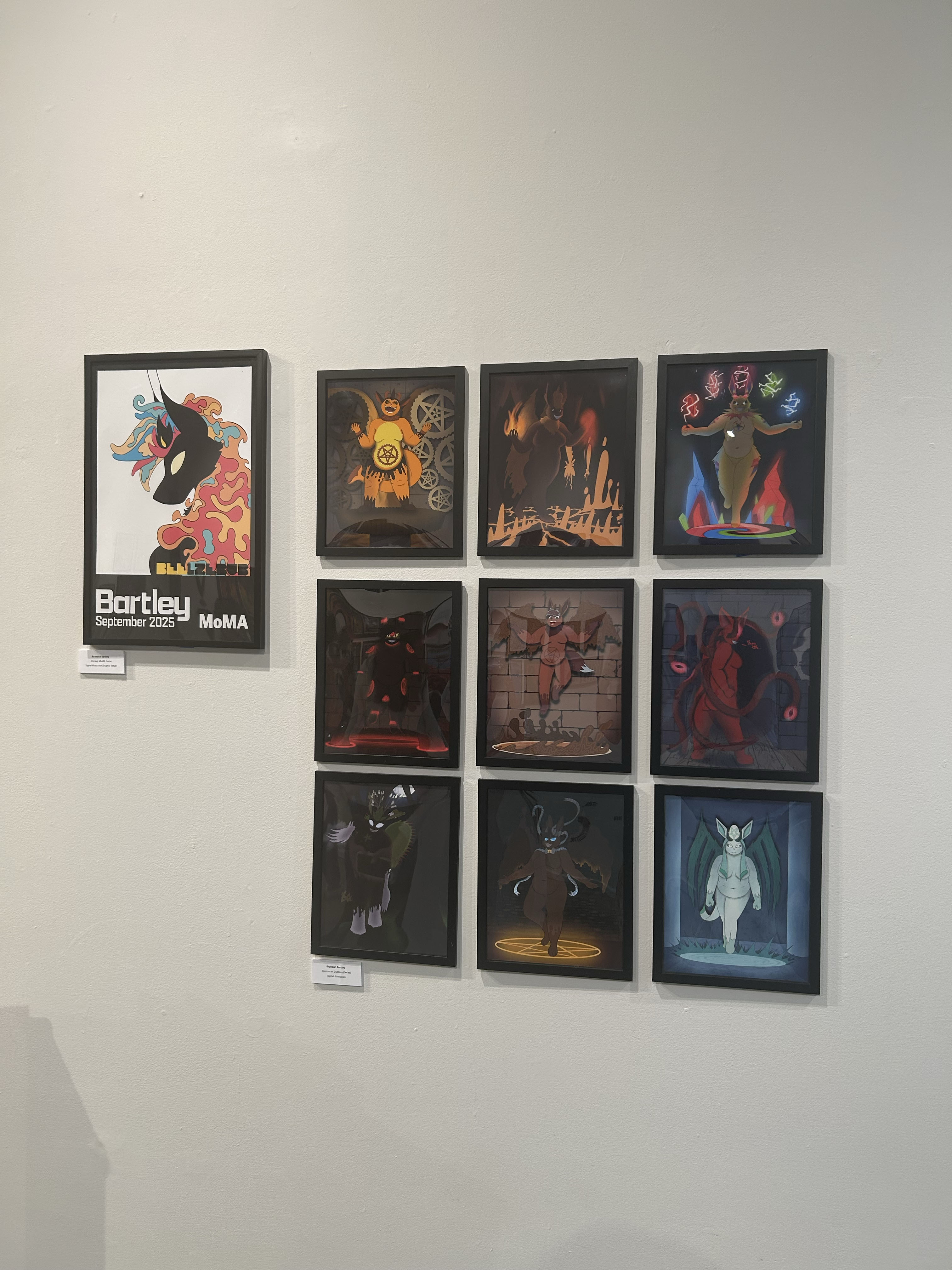 Another display where I love all of the artworks featured, this one by illustration senior, Brandon Bartley. The digital characters truly come to life, and their vibrant but dark colors are so much fun! (I also made sure to grab one of their pins).