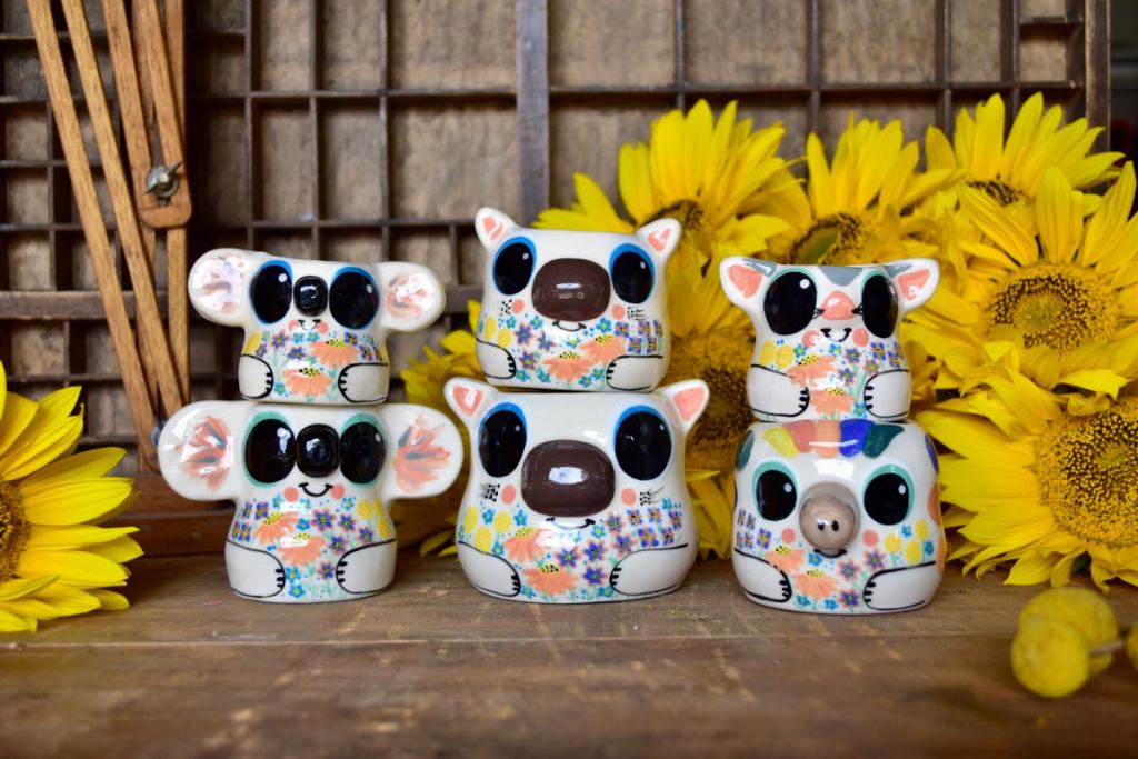 Similar to the rest of Shelby’s ceramics these Australian animal plant holders are made from pouring clay slip into a mold, but these specific molds were made by Shelby herself! The mold is secured by a large rubber band and the excess slip is poured out of the mold, to make sure the piece is hollow. The mold sits until the slip inside it has firmed then the mold is opened and the piece is removed. The ends of the ceramic piece are cut off the prevent sharp edges and the perimeter is smoothed. Shelby then decides on a color palette, pattern, design, and texture for the piece, and afterward, the piece is dipped in glaze once it is dry to achieve a nice shine. The piece is then placed in the kiln to fire and the process is complete.
