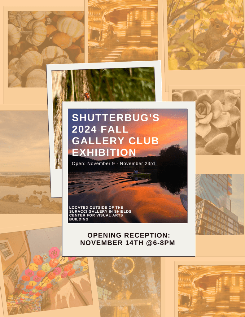 Marywood University’s Shutterbugs Photography Club members are hosting a fall gallery within the in the Shields Center for Visual Arts building on the 2nd floor outside of the Suraci Gallery. This gallery exhibition begins on November 9 and it will run until November 23, 2024.