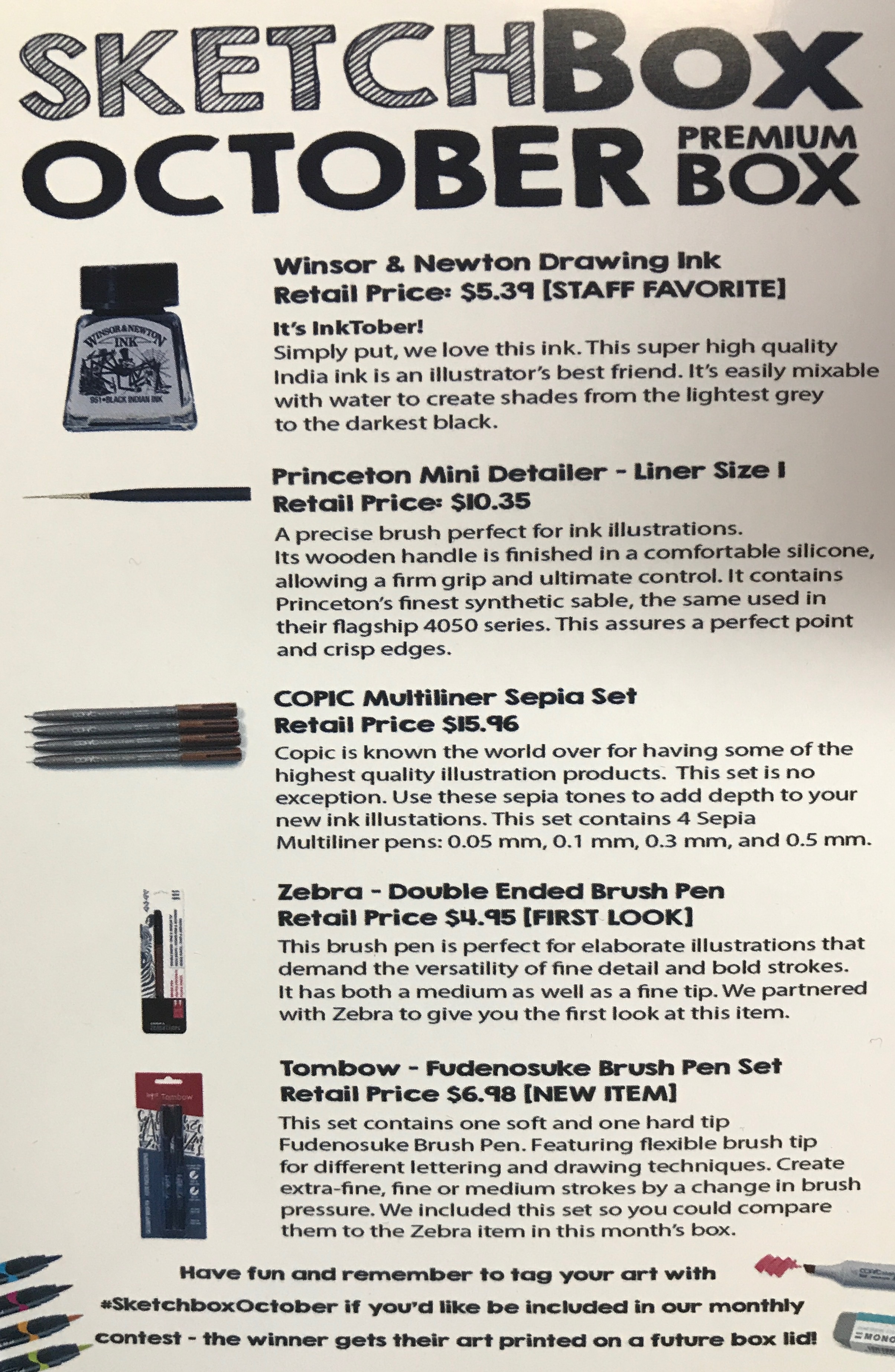 This month, the featured artist was Nedko Chulev. The supplies in the box were mostly ink pens which is the featured artist’s favorite medium. In every box there is a different story which is interesting to read about each artist. If the work of the artist interests you, you can find them on social media usually on their instagram or facebook page. The box contained Winsor & Newton Ink, Copic Fine Nib Inkling Pens, a Princeton mini-detailer brush, a Zebra Double Ended Brush Pen, and Tombow Fudenosuke Brush Pen Set.