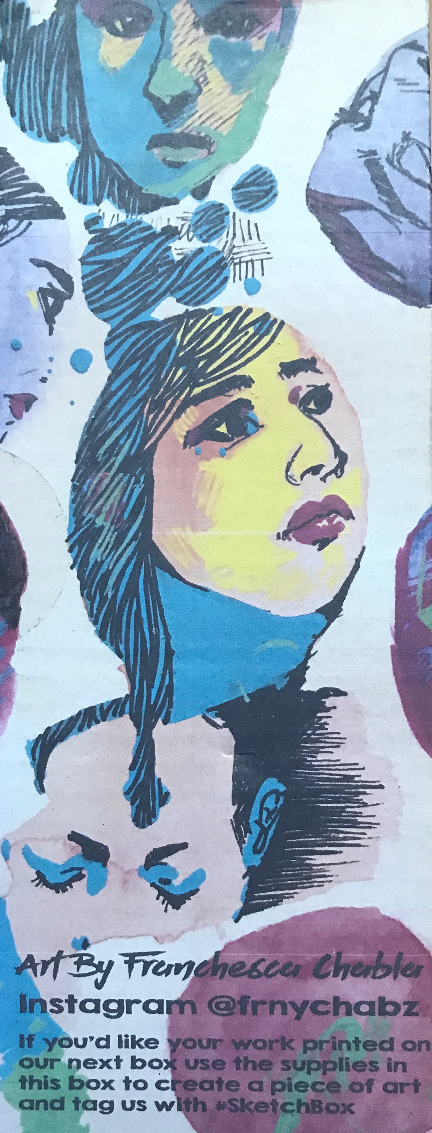 Each box contains a SketchBox sticker, 4-6 art supplies, a card describing each item, and a card of the featured artist for that month which usually contains a short biography of the artist and the artist’s work on the back. Another interesting thing about this subscription box is that on the box, there is the art work of another artist. Each artist on the outside of the box is chosen when an artist uses the materials from the previous box and posts it on social media with the tag #SketchBox.