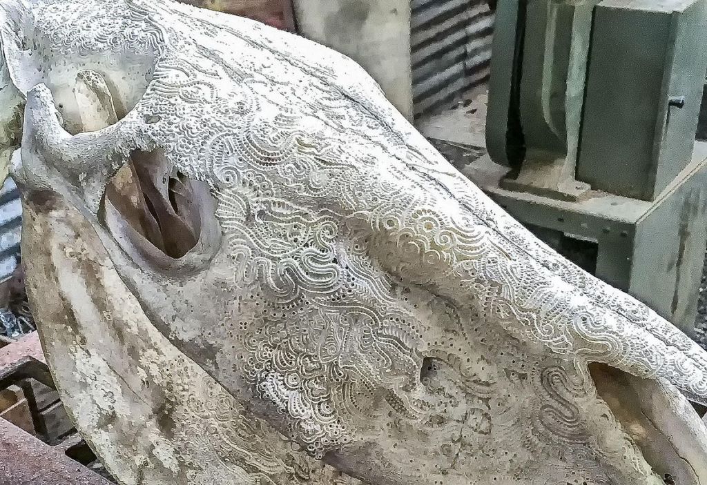 On our journey of learning about sculptors and their amazing creations, I want to talk about the fascinating concept of creating beautiful designs using bones as the canvas. Skull-carving is the art of etching and chiseling designs on cattle skulls. Sometimes those bone carvings are decorated with paint and natural elements like feathers. Before the carving even begins, the most important thing to do is to have a good canvas to work on. The skull is ideal because it provides the biggest surface to work with. Other bones can be used, but they are far less common. The best methods on how to properly clean and prepare animal skulls for decoration and carving can be found on Melodrama’s blog. It also has a great step-by-step and explanation on how to DIY!