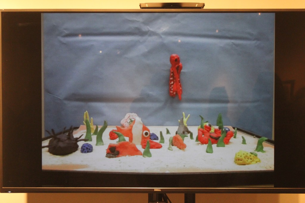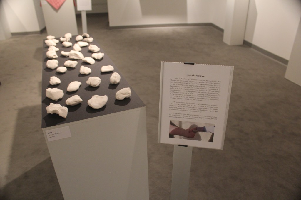 Paige Owings, our fabulous graduate student, worked with the SOAR group over 15 weeks. As a ceramic artist, she focused her work exclusively on experientials that explored clay work. As part of her internship, she assisted in my pilot research exploring the therapeutic effects of clay work that was modeled after my dissertation research. Paige guided the SOAR students in developing their own unique collections and artist statements. She focused on sculpting and working with various types of clay. The students also participated in the creation of three collaborative group artworks: A Beautiful Picnic, The SOAR Village, and A Day in the Ocean claymation video that was presented in the gallery. In addition, Dr. H and Paige co-facilitated an adapted version of Touch in Real Time, a ceramic project by Dr. H’s previous mentor and friend, Holly Hanessian. The project is socially-engaging art that emphasizes the experience of shaking hands while holding clay and having conversations.