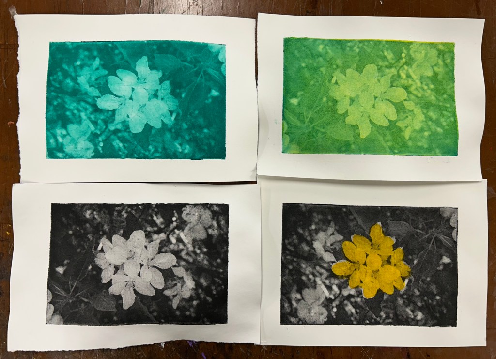 To start, I used a green/blue color ink on the plate because since it is a photograph of leaves and flowers I thought that fit the theme. I was extremely shocked with how well the first print came out and how much detail held up in the plate! After that, I experimented combining colors, using more of a yellow color in the middle and the same green on the outside, and it all kind of blended together to create a light green color. This print did not show up as well and I think it was because the ink was so light and the details were not shown as well as they were with the darker green. I think I ended up printing over these again with the darker green color and it came out better! Then I decided to just do a print with the black ink so it printed like a black and white image and I actually really liked it. Below are the first few prints I did, and the different color greens are the ones that I re-printed over!