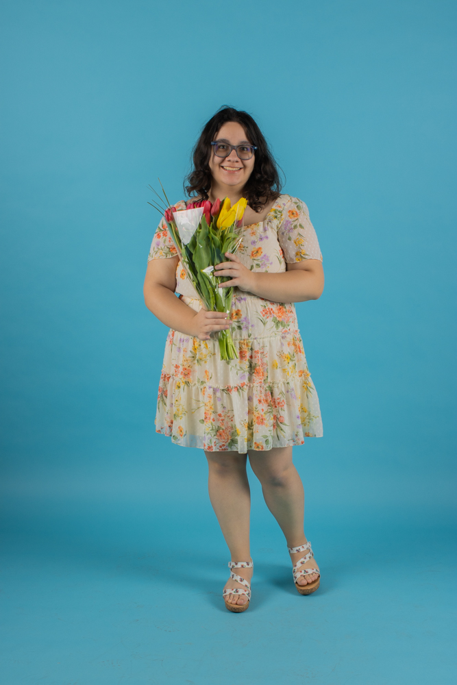 The Fashion Club and Shutterbugs have been together since the start of their club. We have helped them create fun photoshoots on campus that anyone can attend. For this photoshoot, we wanted to do soft pastel/ florals. I chose the blue background because I thought it complemented well with the theme well.
