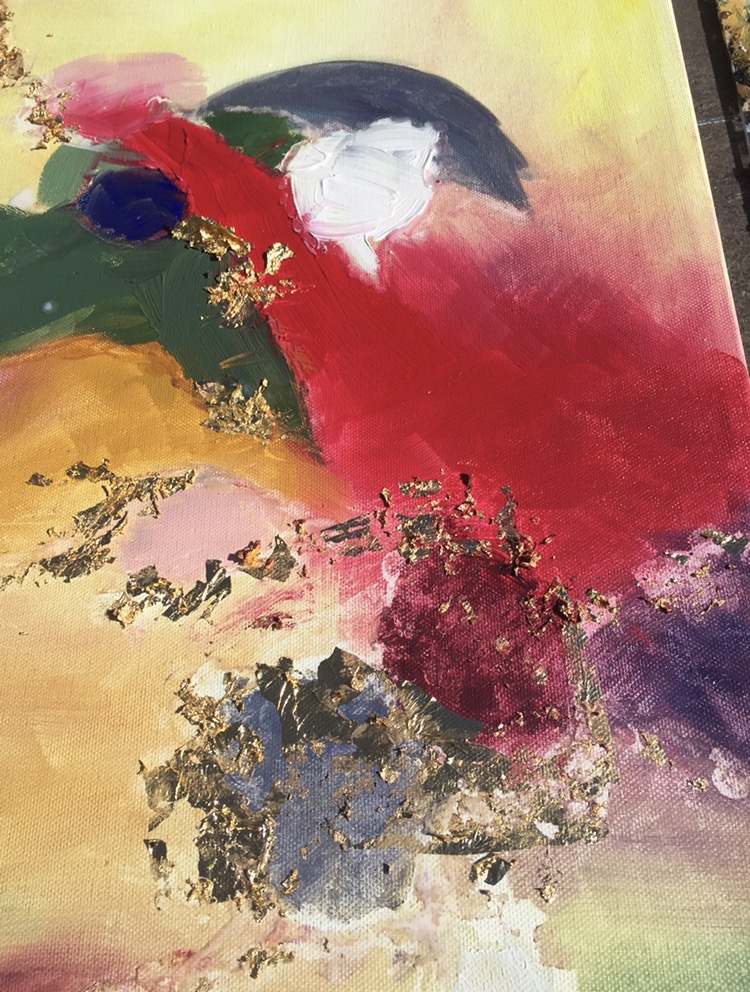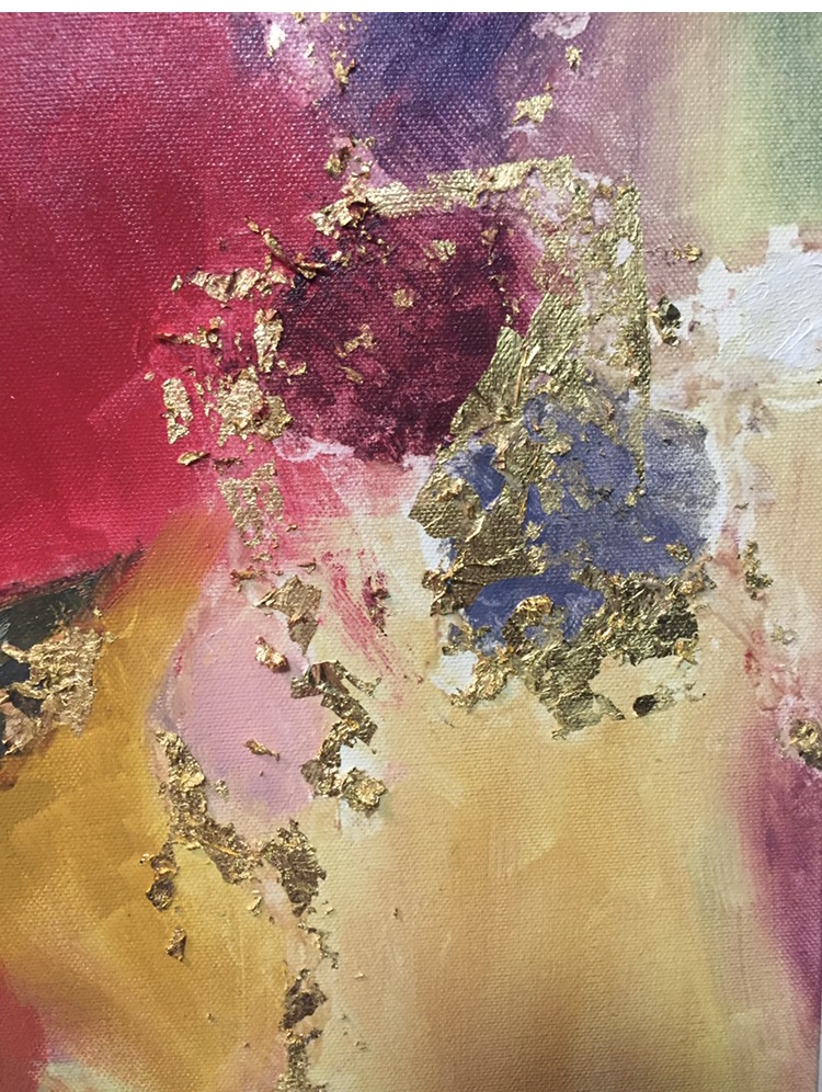 You’ve all already seen the one based on Impressionism, the Paris rooftops. But I made another piece that is of abstracted stained glass. I started out with thinning down my oil paints, and choosing a light, pastel yellow for the base color. After I covered the canvas in the base color I began blocking in some more vibrant colors, like the ones I would see in the stained glass. I struggled with deciding whether or not I wanted to keep the edges of the color soft, and blending together, or use harsh lines that were used in stained glass. Next I had some gold leaf that I wanted to incorporate into this piece! I love gold leaf and how it looks in paintings. I made the mistake of trying to adhere the gold leaf to the canvas when the oil paint was still wet (I’m so impatient)! I let the painting dry for a week or two, and went in and added the gold leaf. I used the gold leaf to block off different colors, and used it as a divider. I absolutely love the result and would like to make more paintings like this one!
