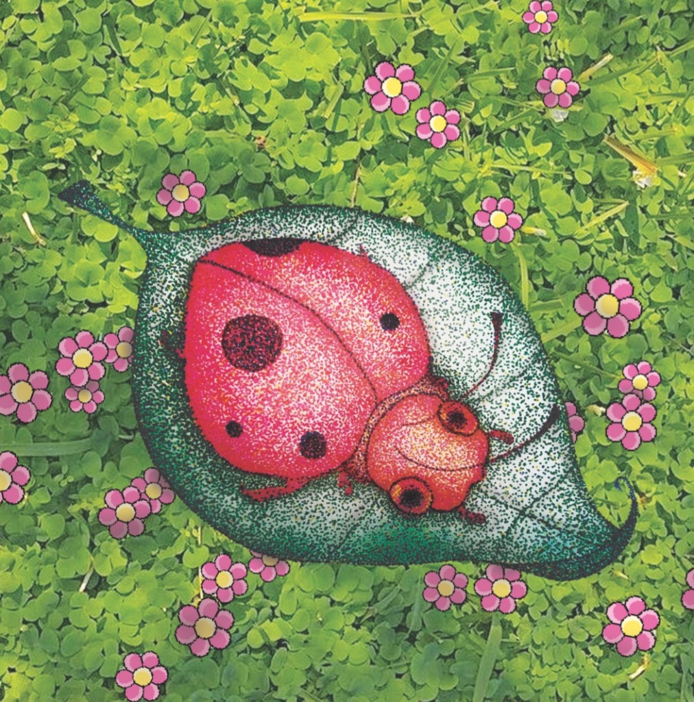 I began by masking the bug in Photoshop to remove the white background that it was previously on to just get the illustration itself. I then started to scour the internet to find the perfect patch of greenery for the bug to rest on in the new piece, and settled on this really aesthetically pleasing photo of what looks to be a clover field. After that I added some pixelated flowers and placed them over actual flowers that were in the original photo because I thought that it would look really organic and I like the random natural placement of them in the finished piece. Once I had did all of that I felt sort of stuck because I felt it was missing something as the bug did not look so cohesive with its surroundings. But then I tried out the darken tool in Photoshop and made certain areas of the stipplebug and pixel flowers darker in order to achieve a sort of shadow effect. I also followed the natural shadow of the background image which I think took the piece to a whole other level and really helped the illustration blend into the new environment!!