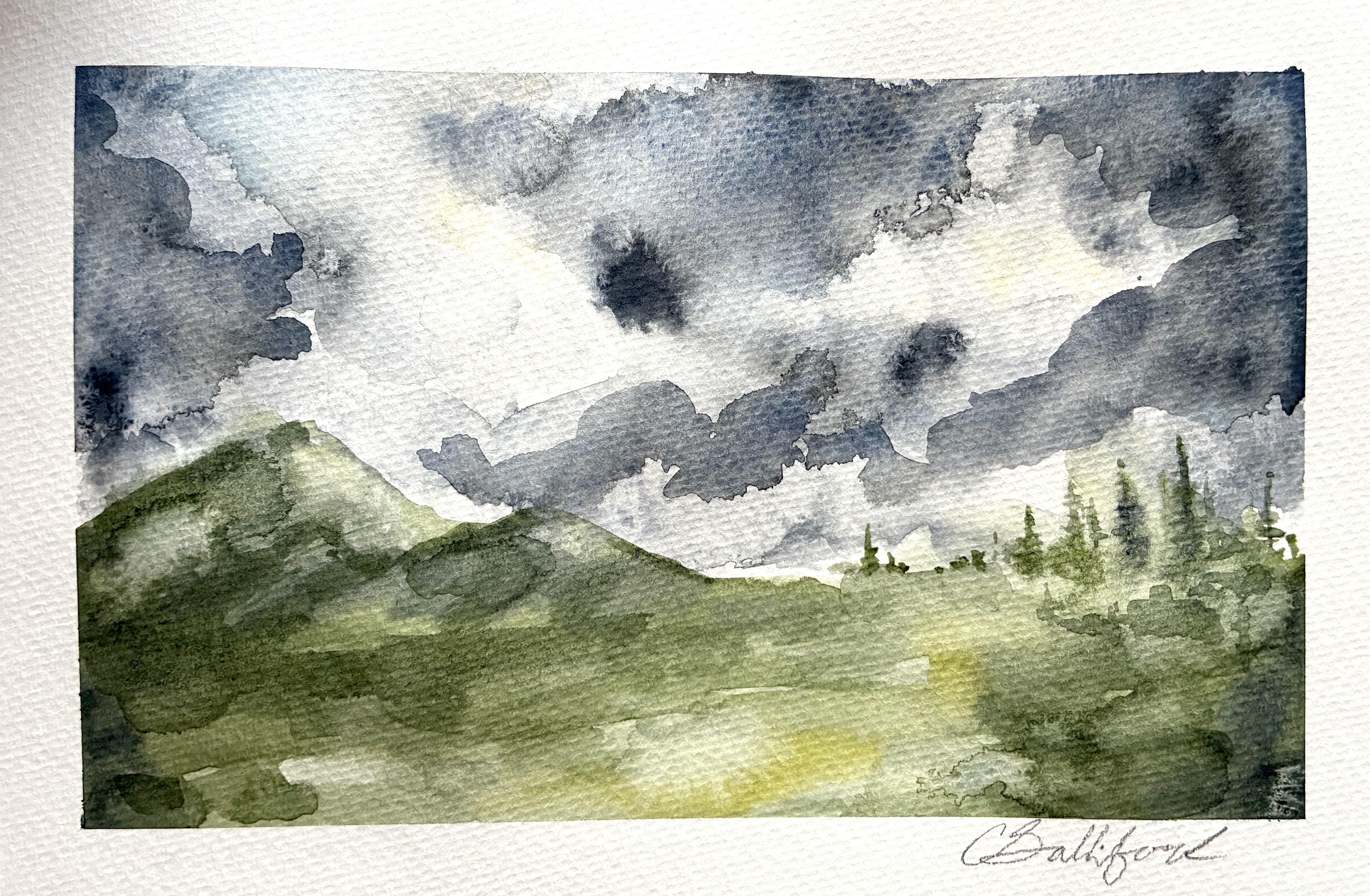Recently, we have been learning about low pressure systems and what the weather would look like within these areas. Typically, low pressure is the perfect environment for a storm to form. So, I decided to paint just that! Something I have really learned I love painting is landscapes, so I figured I could paint a stormy landscape for this project.