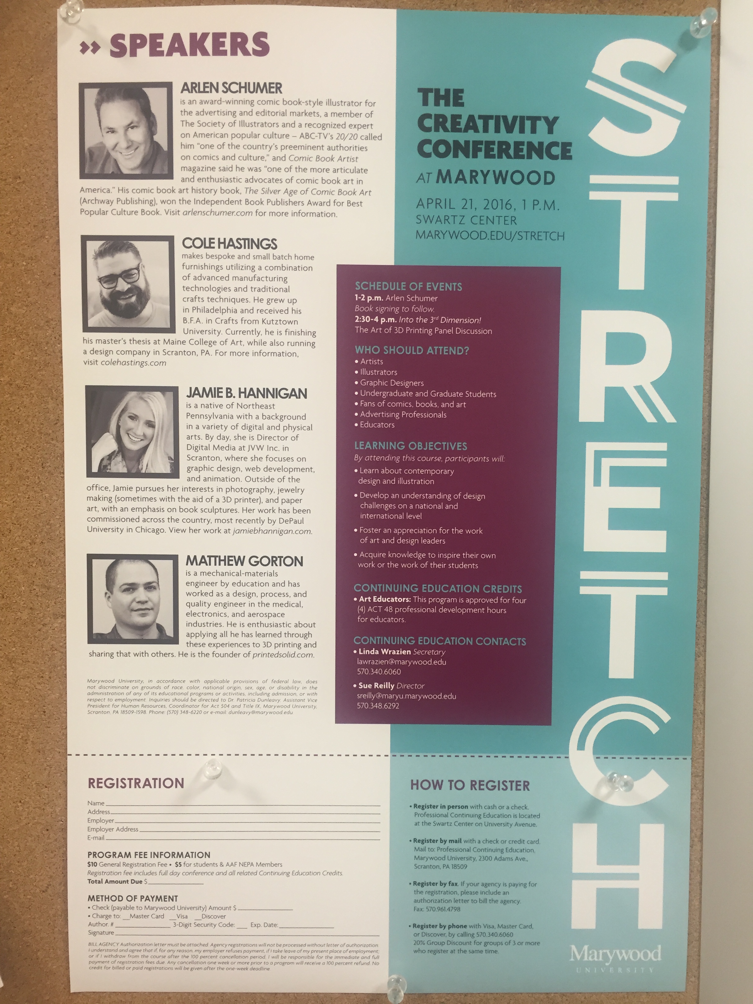 The Stretch Conference is also known as the Creativity Conference and it happens here at Marywood. It is an exciting day for creatives to come together and learn more about art and design. We will have 4 speakers this year, so there will be a lot to learn. It is a great opportunity to further our education from designers in many different fields. It will be great to not only hear them speak, but also to interact with the speakers and also with other members of the creative community that will attend. I am already getting questions together to ask!