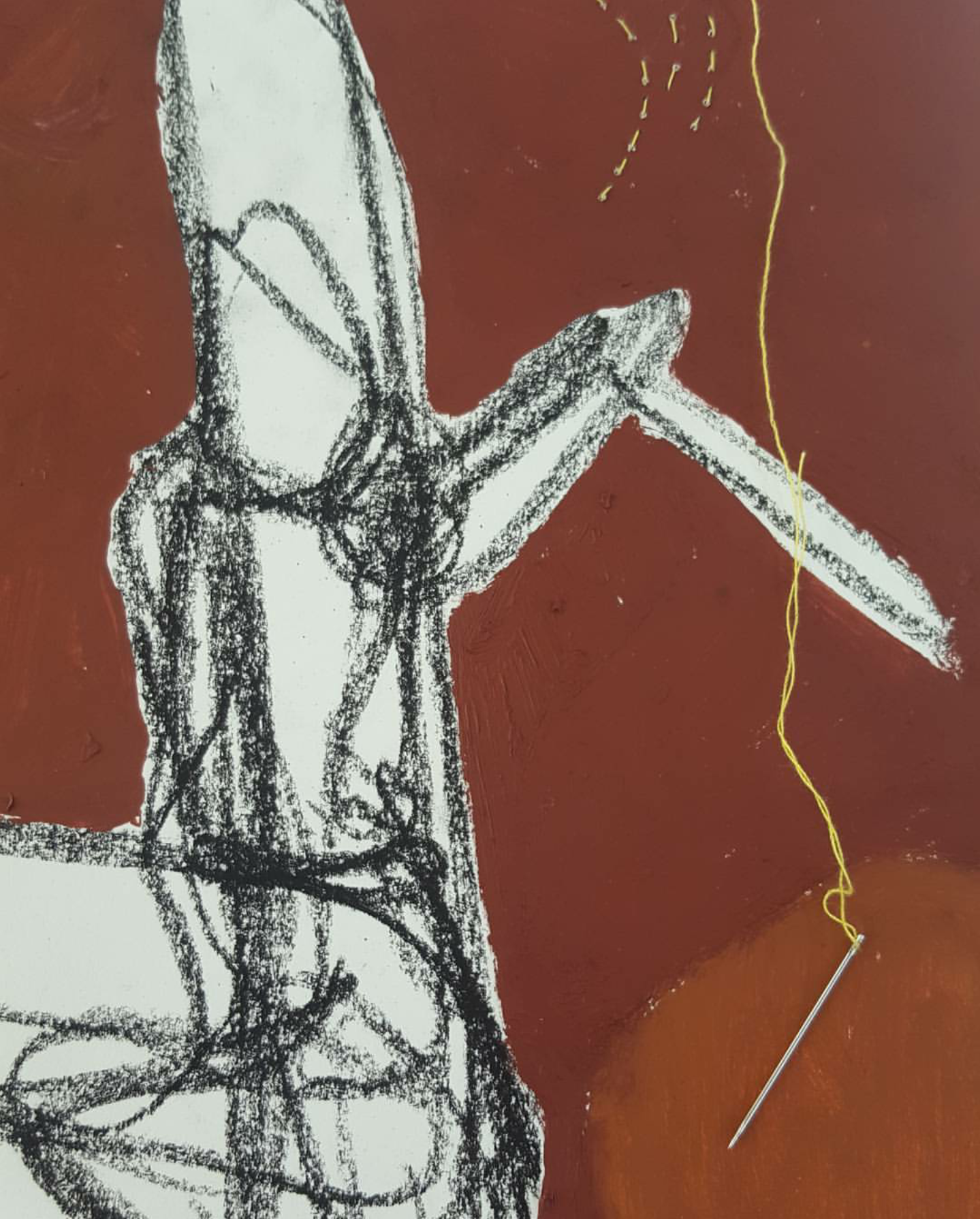 Tell me about what you’re working on currently. I’m in a period of pure exploration. I’ve stopped using stretched canvases and I’m painting on un-primed canvas material and paper mostly. I’m moving in a more abstract direction, which is something I never thought I would do. It feels comfortable. I’m also working with different media in pieces. I’ve really enjoyed stitching with embroidery floss and thread, markers, and charcoal. I think my recent pieces have captured a new depth of something I can’t put into words yet. They aren’t necessarily works of art that should be hung in a gallery, but they’re very meaningful and I feel more accomplished.