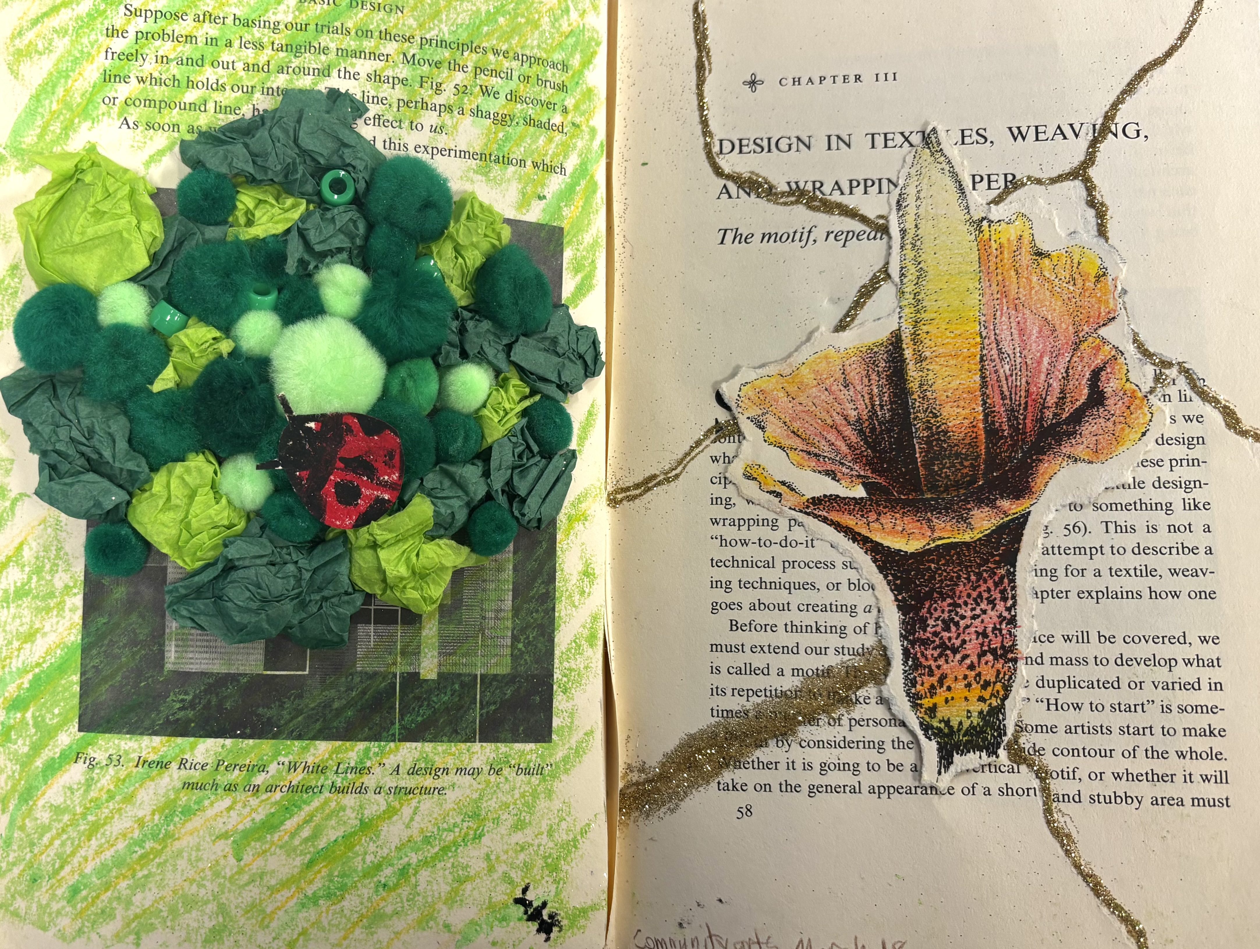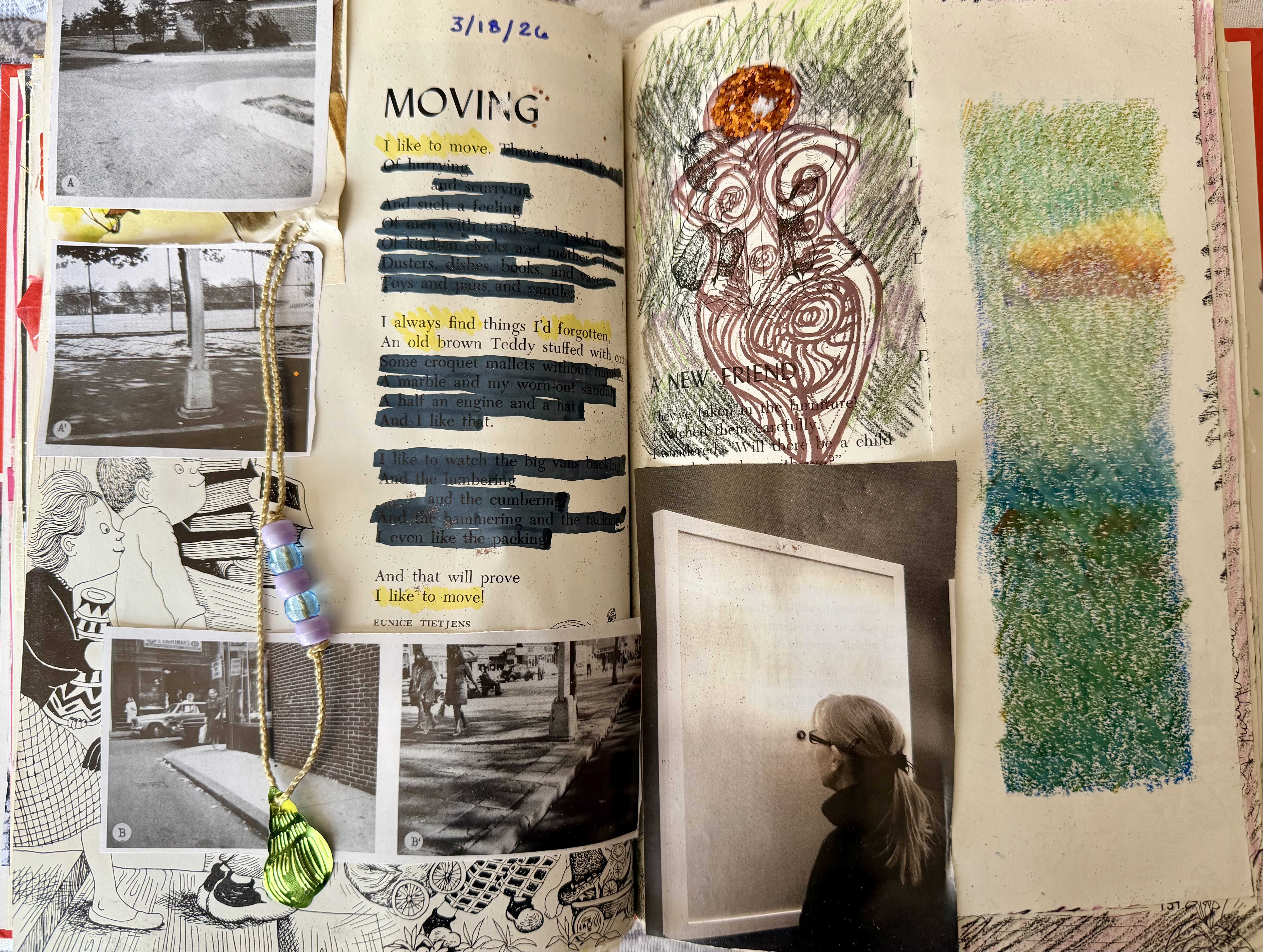 I found a poem in my book titled, Moving, which resonated with me because, on this day, my ability to move was hindered due to a sprained foot. I was excited to experiment with a color study using oil pastels, inspired by the works I saw in the Pisani collection. I collaged a picture of a woman in a gallery closely observing a piece of art. I also included black-and-white photographs of everyday scenes, which reminded me of the Shutterbugs exhibit, as I recognized several locations around Marywood in their photos.