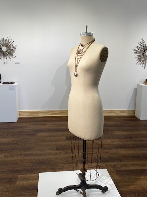 When reflecting on Abby Oxford’s Beauty in the Imperfections exhibition, I chose a stamp that resembled her artistic style. I used copper ink and glitter to represent her copper process. I then incorporated a piece of hemp string into my two-dimensional work, arranging beads asymmetrically on one side to echo a distinctive element of her designs. Finally, I added a shiny shell bead dangling in the center as a representation of the natural treasures she incorporates into her jewelry.