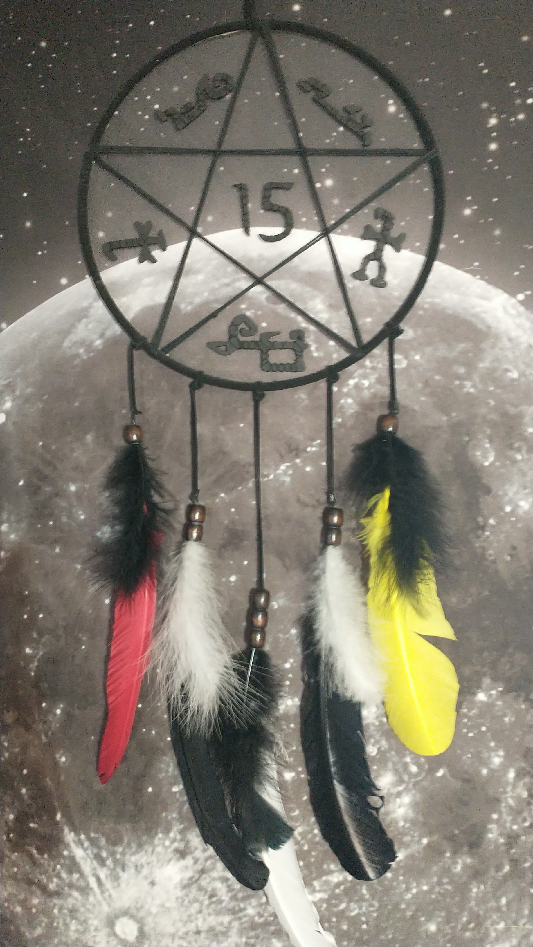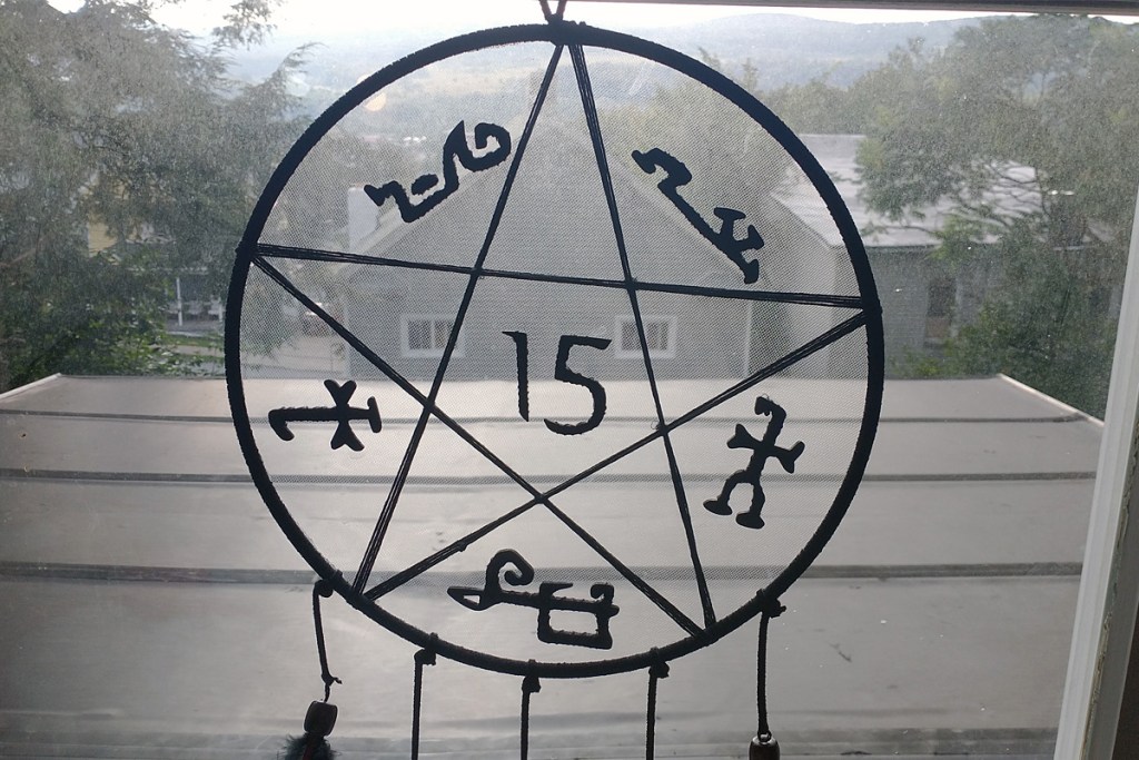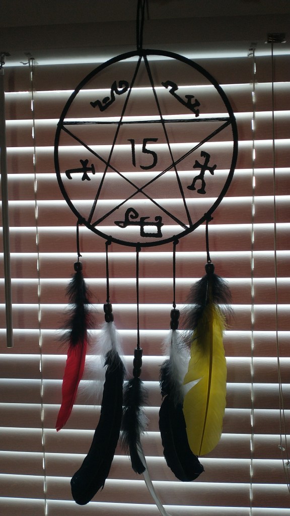 A long, long time ago, when I was fifteen, my absolute favorite show, Supernatural, announced that season 15 would be the last. Heartbroken, I wanted to make some art dedicated to them. Before, I had searched online to see if a Supernatural dreamcatcher was a thing I could buy, but I had no luck. Fortunately for me, I could find out how to make one. So, set as I was, I went to the craft store and got my supplies. My idea was to make the pattern, inside the catcher, a demon-trapping sigil (aka a devil’s trap) and have the feathers represent a character.