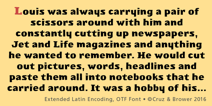 The face was one that I called “Satchmo”, so named for the subject of a book I had written and designed in 2009, on jazz great Louis Armstrong. I originally created the face on commission for a CD cover for the band Fishbone in the mid-90s but it was never used. When I was designing the book years later I realized it was the perfect font for the subject and expanded it, to utilize for the title and chapter openers. The type was completely cut out of black paper with an Xacto knife. When Ray told me to create a digital font I would need to create all the upper and lower case characters, punctuation and glyphs, I panicked. Could I still cut type out of paper after so many years? It wasn’t until Seymour said to me “just draw them” that I realized this was in the realm of possibility. Thanks to that advice and Ray’s amazing patience, the font was completed, maintaining its unique hand-cut quality. Ray then did all the heavy lifting, creating a complete Open Type font. Both “Bouncing Checks Layered” and “Satchmo” are available from myfonts.com.