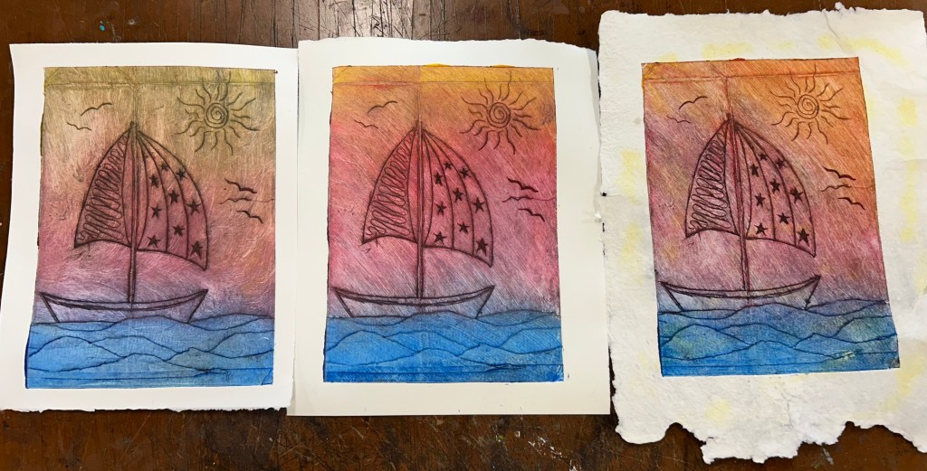 For printing, I first started experimenting with black ink, paired with blue for the waves on the bottom and it printed pretty well. It gives a sort of eerie effect with the black and just the hint of color on one part. Then I decided I wanted all of it to have more color so I created a gradient with blue, red, and yellow and it came out amazing! I just wiped the different ink colors onto the plate and then blended them together with the tarlatan cloth and they came together very nicely. I printed that one twice, the second time adding more red with the yellow on top so it was more saturated. I even got to print it on one of my handmade papers and it held up very well! These are the results: