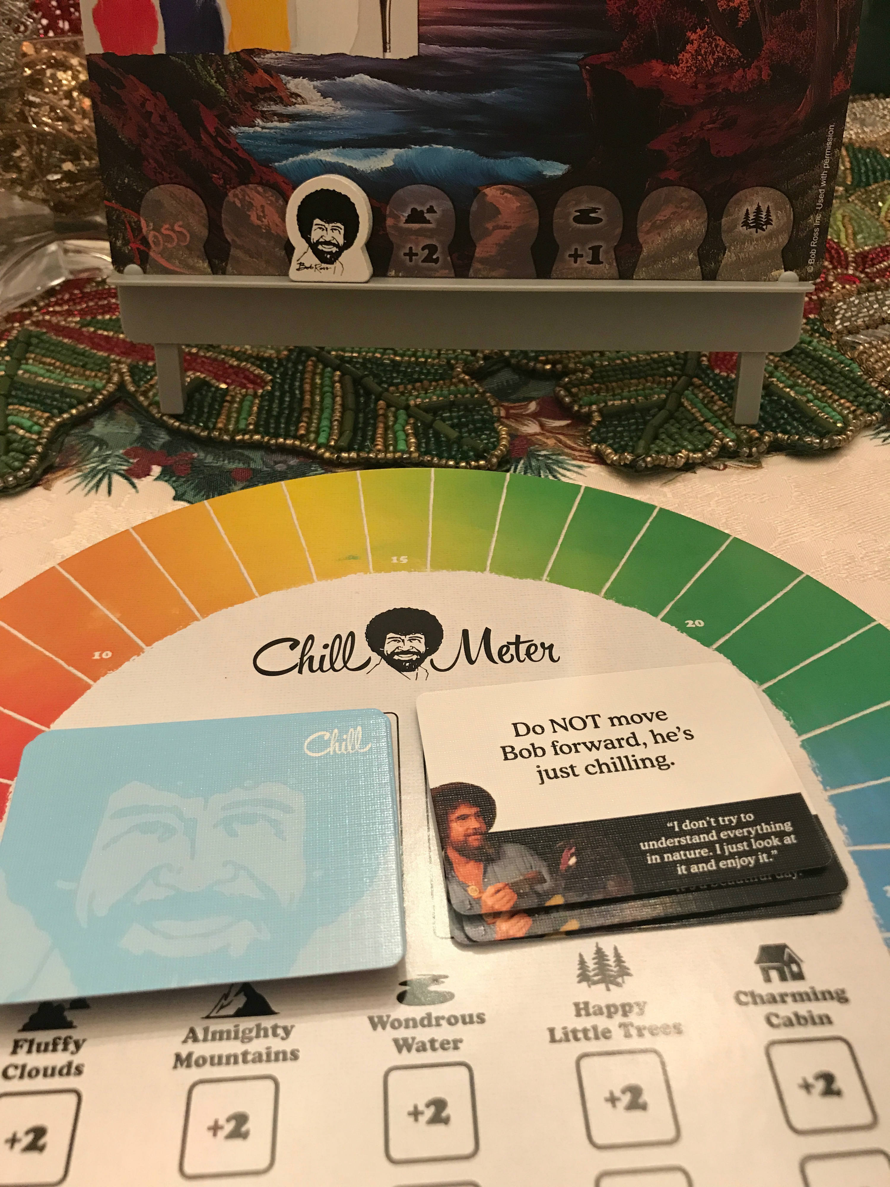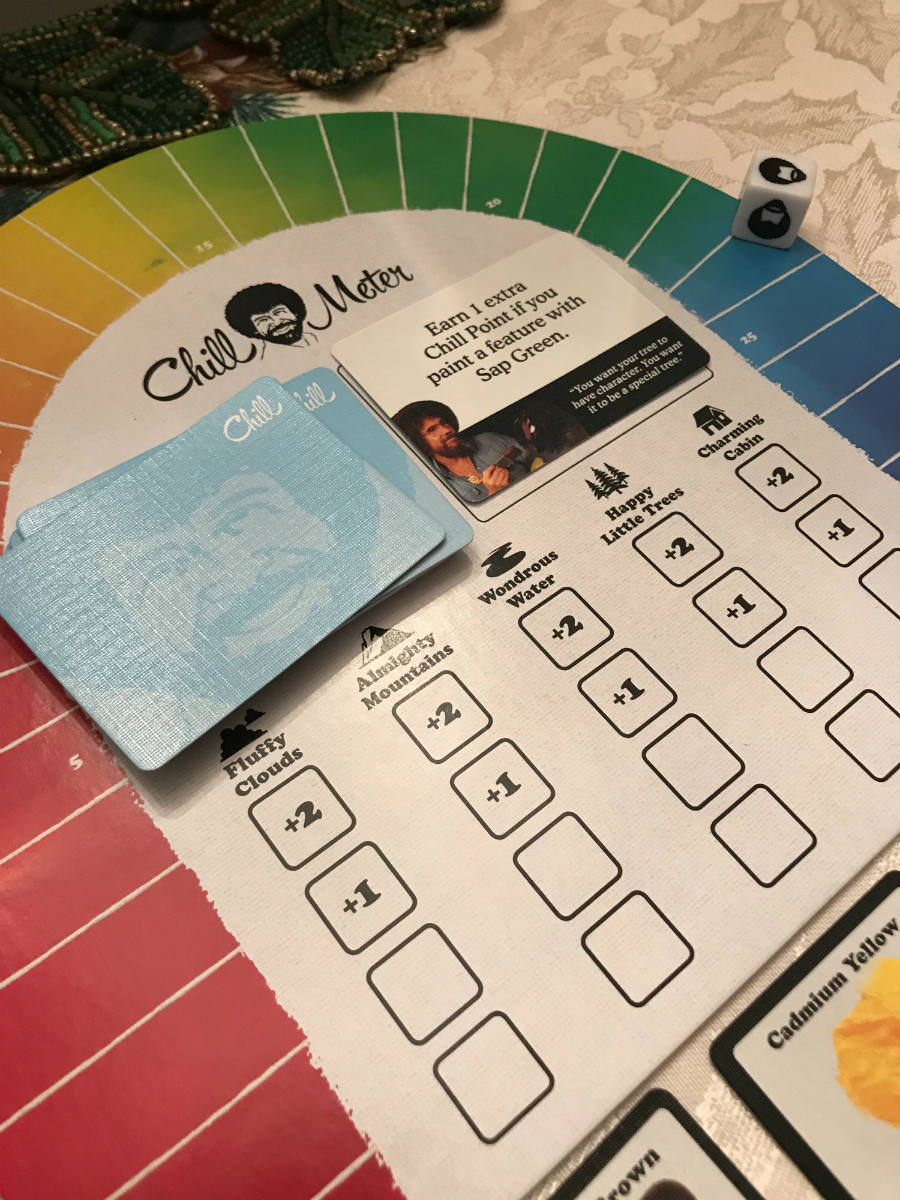 On the dice, there are 3 Bob Ross silhouettes that when rolled, a “Chill” card is flipped and the small figure on the easel moves over a space.  Once the Bob figurine moves to the end he wins the game.