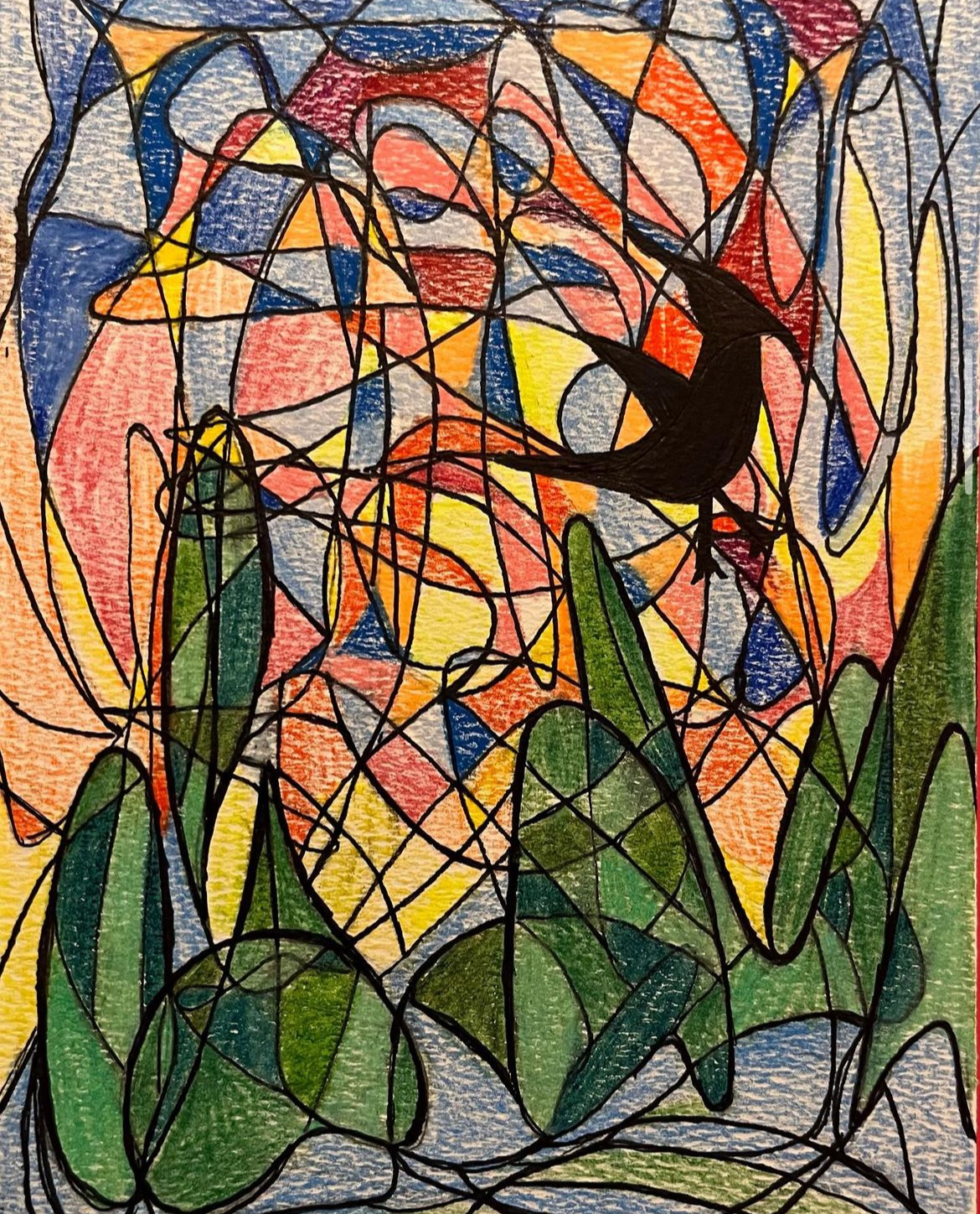 In the scribble, which I titled Left the Nest, I noticed the shape of a bird and other forms that reminded me of trees or mountains. This led me to create a colorful scene of a lone bird flying over a landscape. At the time, this image reminded me of my brother’s departure from our childhood home and helped me understand that it made me feel sad and lonely to see my best friend move out. The scribble drawing allowed me to associate what I was seeing with what I was feeling deep down.