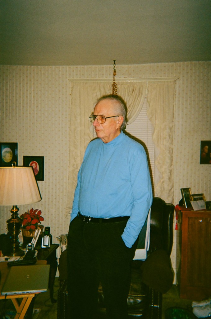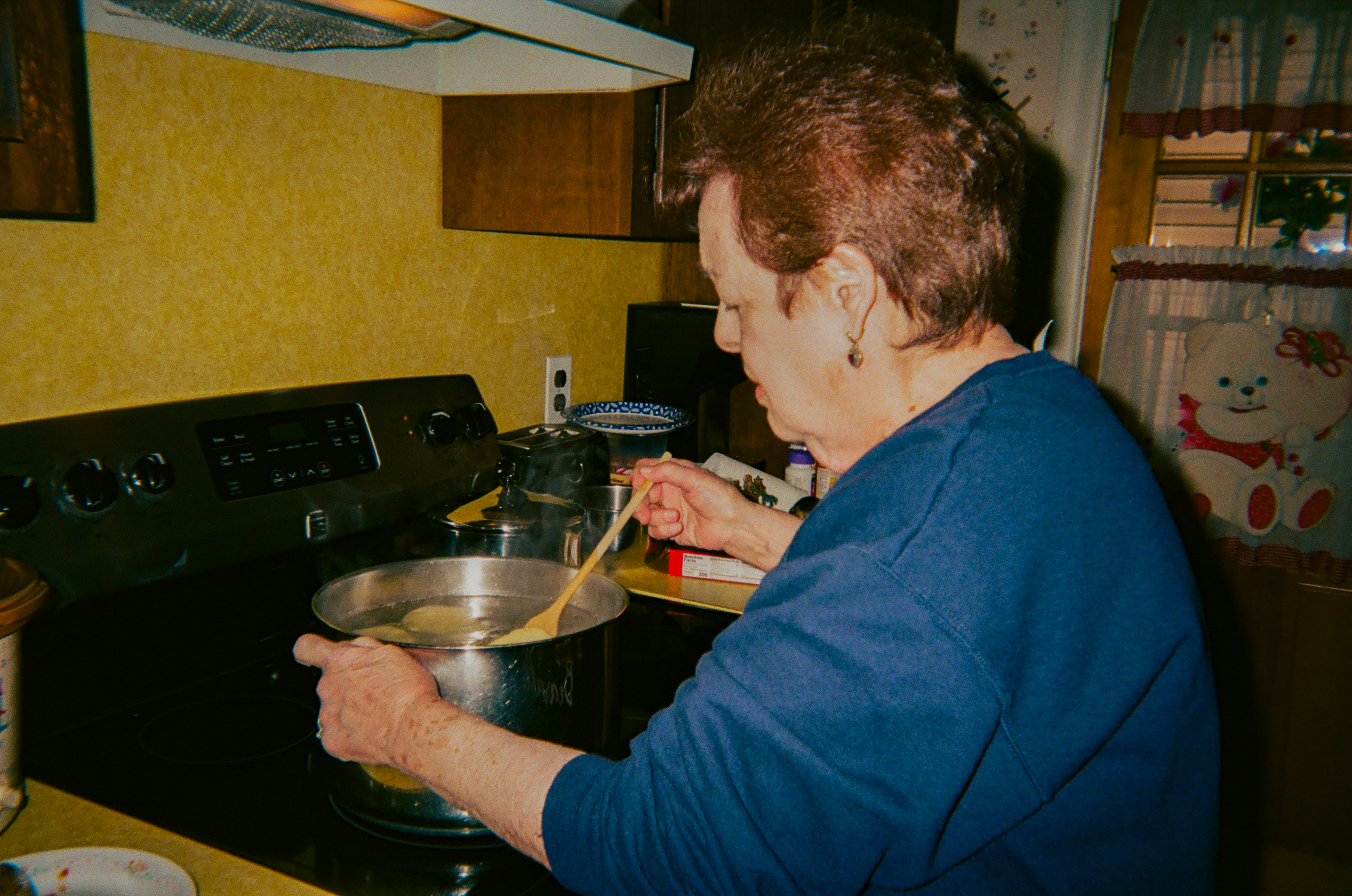 The theme of the member show that my work was featured in was film photos of family, focused on disposable camera photos. I chose these two images because they captured moments that felt so real and authentic to me, and were scenes I had seen a thousand times. My grandfather standing in front of his chair watching a basketball game on television, and my grandmother making what my family always considers too much pasta for the six of us. I did edit the digital scans to fix some overexposure due to the proximity of the flash in the photo of my grandmother, as well as making my grandfather stand out more in his photo.