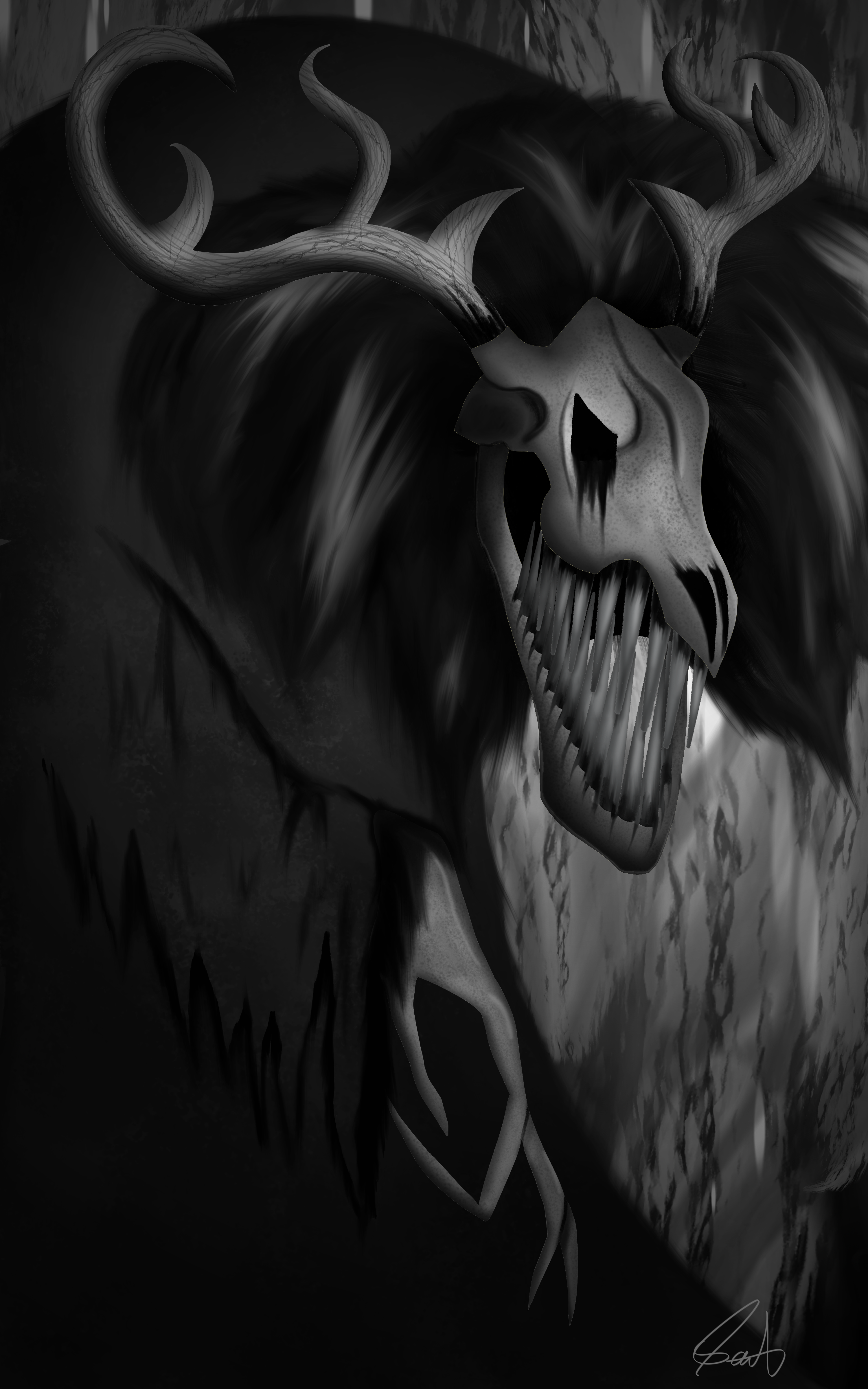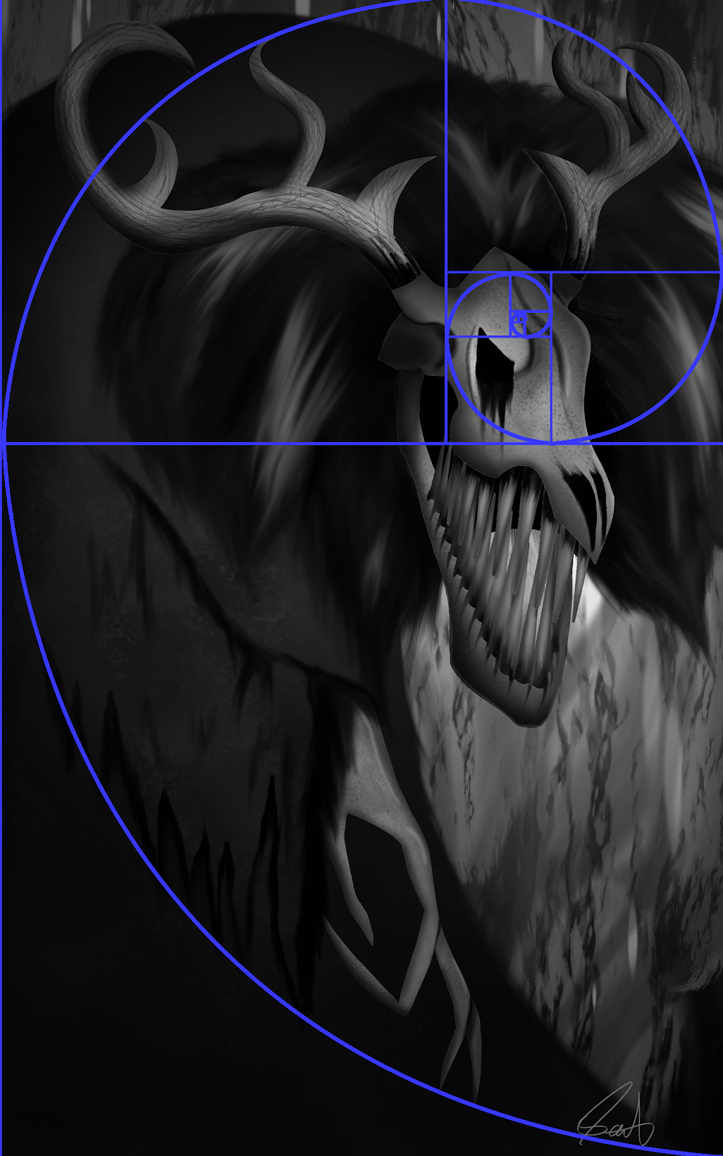 As you can see with the armature on the right the Deer Demon was constructed alongside the Golden Mean Ratio. Many aspects of the design; such as, fingers, antlers, back curvature, and head are aligned with the armature.