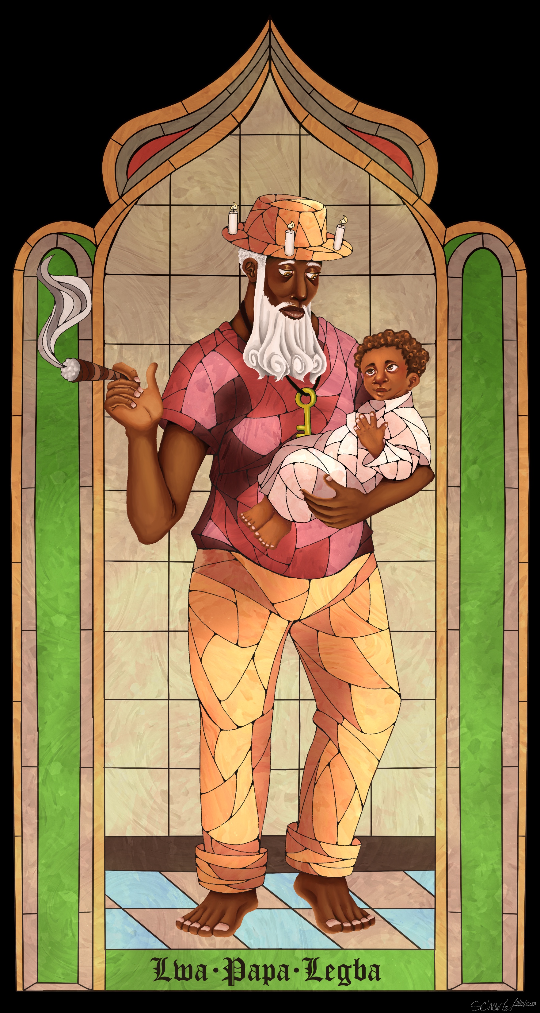 This piece is a reference to a stained glass portrait of St Anthony. Because he is often depicted holding a child he would be synchronized with Papa Legba who was loved by children.