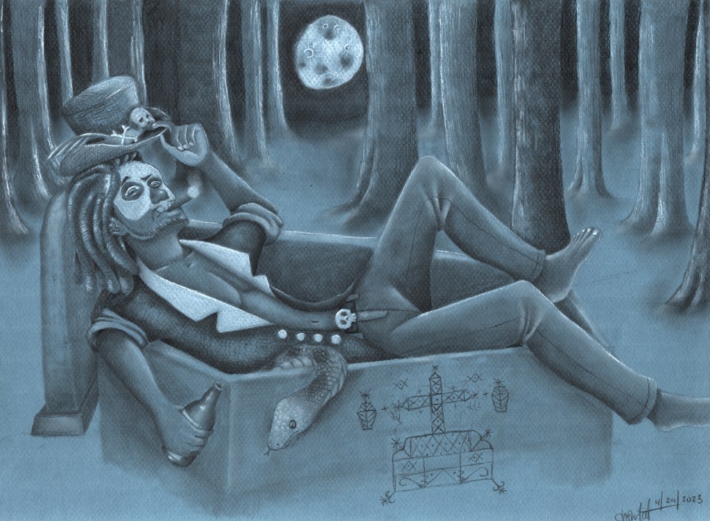 References to Voodoo are in many popular media but paint Voodoo in an evil and demonic light. Vodouisaints (Those who practice voodoo) worship a pantheon of spirits, also known as Lwa, they are typically portrayed in a relaxed or assertive non-demonic nature. Some may be rum drinkers, smokers, and representations of rage while others are laid back simply being guardians of the young. Each spirit has a veve (symbol) that represents them in a ritual so be on the lookout for where the veve’s are in every piece!