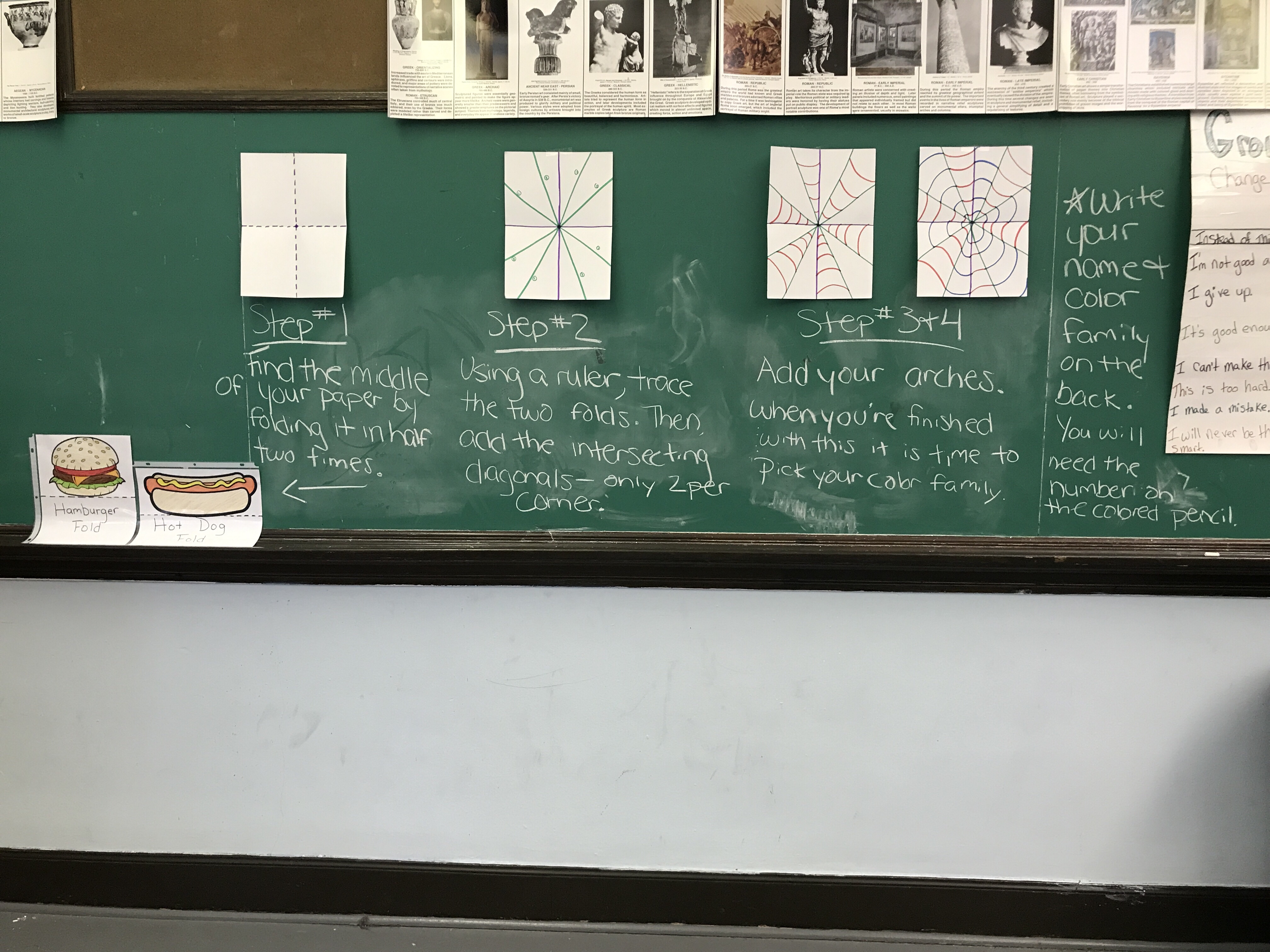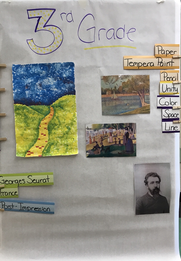 The 3rd grade classes are learning about landscapes and Georges Seurat. They got to watch a video about Seurat before we began. Each student will get to draw their own landscape, that incorporates a horizon line and a vanishing point. We will then finish our landscapes by painting them in the style of Pointillism with the primary colors. I am hoping that students will start painting their final product this week, as I am eager to see how they do.