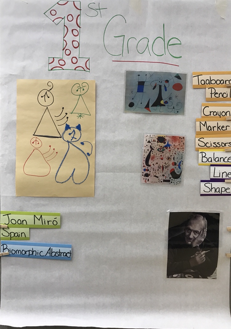 The 1st graders are learning about Joan Miró. We started the lesson by talking about abstract figures, and how we can draw things that don’t always look as they seem. They played a game called “Roll a Miró”, in which they roll a dice to designate which pieces of their person where which shape. Then we will work together to create a paper sculpture that will have to balance 3 pieces and incorporate the primary colors. We discussed how mixing the primary colors creates secondary colors.