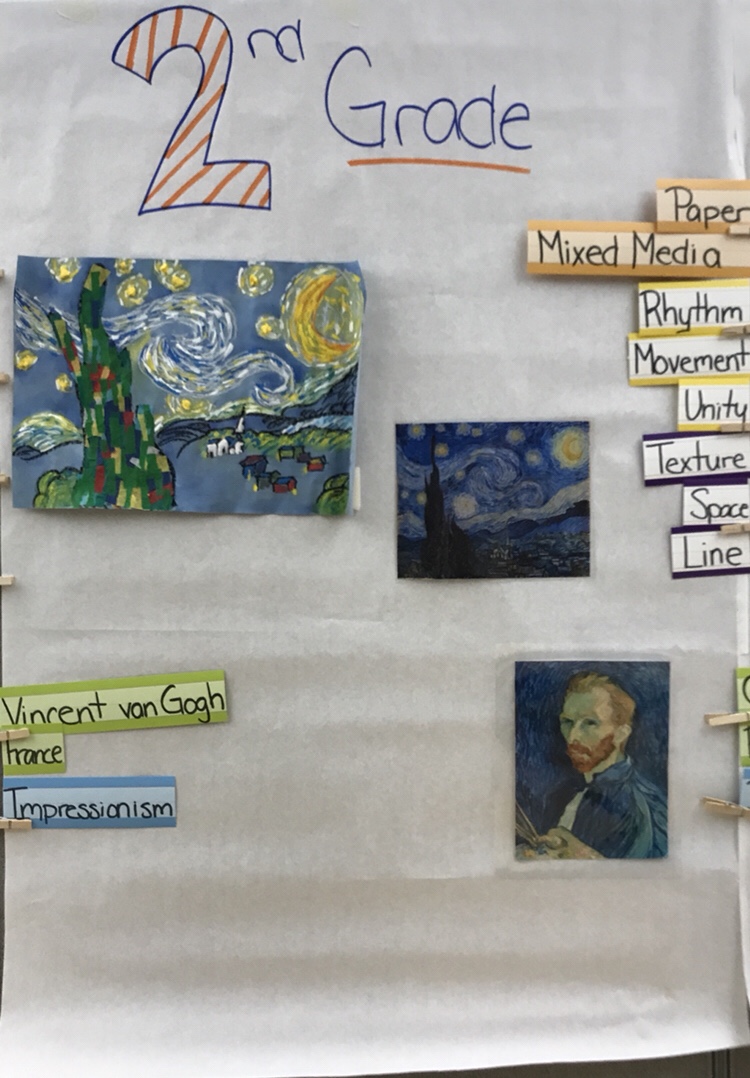 My 2nd graders are experimenting with different mediums and learning about Vincent van Gogh. They will listen to and read letters that van Gogh wrote while he was sketching and painting Starry Night, and experiment with different mediums in the class. The mediums that I have set aside for them to use include- tissue paper, watercolor and oil pastel resist, markers, and liquid Tempera paints in the primary colors. We will learn to draw Starry Night as a class and then use our desired mediums to create a multi-meda image.