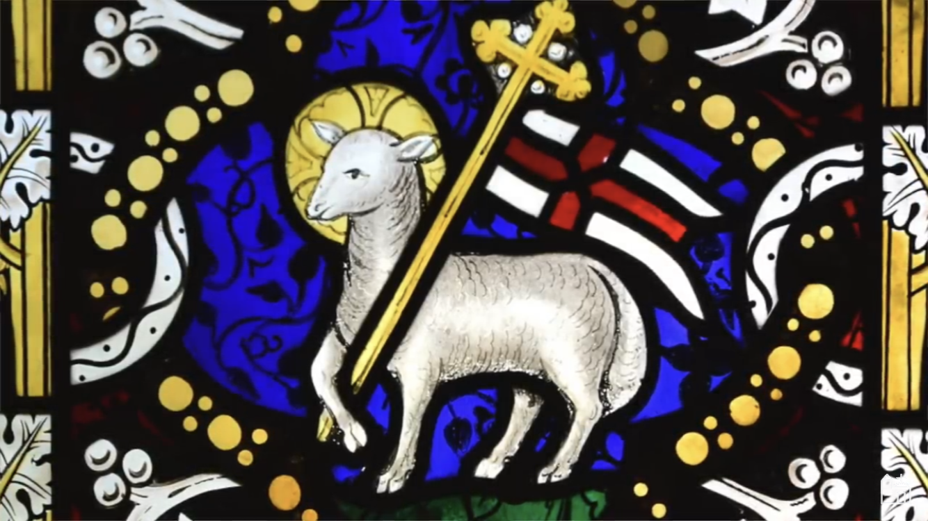 Later on in the mass, an image would be shown during Communion. Though this image is mostly focused on the Eucharist (which is beautifully captured as being part of Jesus himself, but that could be a whole separate post) you can see that in a ring around Jesus there are multiple drawings. To the left of Christ’s head we see the lamb drawing again! This lamb is seated and has a halo around his head. The flag he carries is connected to a cross. My family would again point out the way the lamb’s leg was hooked around the staff and replicate it as best we could (still somehow maintaining the reverence of the mass–if anyone could be reverent and funny at the same time, it would be my family).