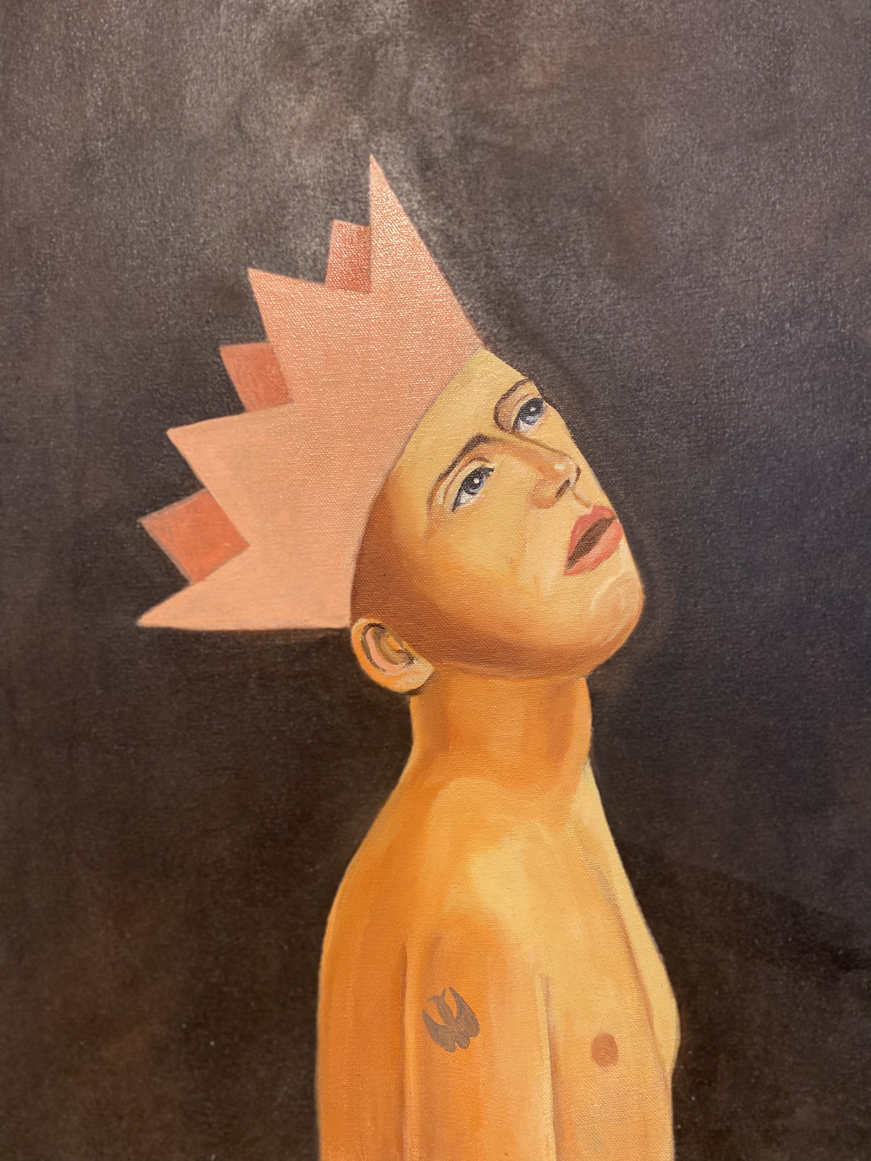 I also adore the presentation of the subject. The black background and highly lit figure harkens back to Caravaggio’s chiaroscuro style, but the shading is extremely flat, particularly on the crown, which adds an element of absurd, almost abstractedness to the style of the piece. Also, I can tell this is likely a portrait of a real person because of the tattoo on their arm. The inclusion of this specific shape (if you happen to know what it is leave a comment) on the specific placement of the arm suggests that this is likely a living person, because if they have a tattoo, chances are they are still alive (or of age to likely be alive). Perhaps it also could be the signature or logo of the artist. Gender is also ambiguous in this piece. While it appears to be a male based on the figure’s chest and lack of hair, the focus is diverted away from masculine/feminine imagery to the focal point… which is obviously the face.