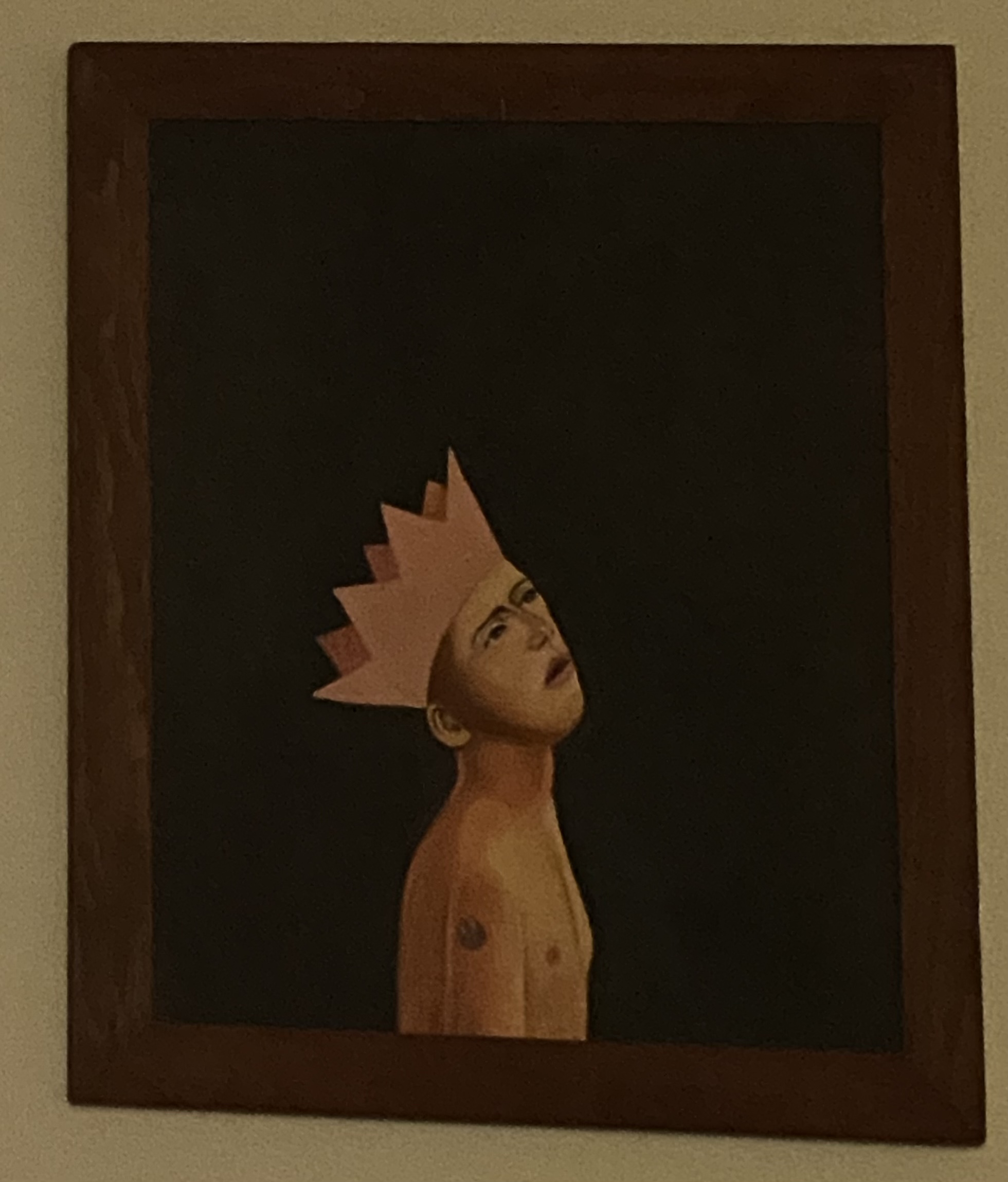 Recently, while exploring the Goodwill in South Portland, Maine, my brother and I stumbled across a painting that stood out as something purely unsettling. We knew immediately that it had to be ours, so we threw it in our cart and paid a measly $8 for this original piece, done by an unknown artist. Once home and hung on the wall of his apartment, the piece sat nameless for the evening until my brother conjured up the title The Naïve King. I think it fits the figure’s expression and the overall tone of the piece, so its adopted name is as such going forward.