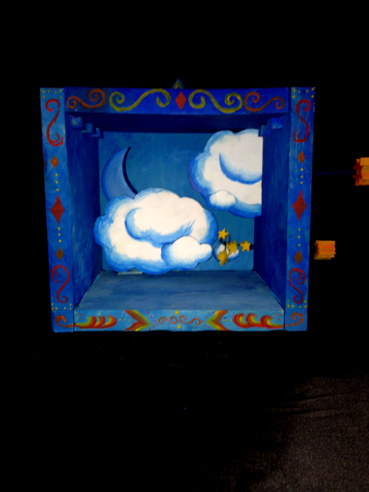 I also used wire for the stars and then glued the wire to a wooden dowel that can be moved on the right side of the box. Both the moon and the stars can be hidden behind the bottom left cloud. To make the inside of the box look darker I added a lid that can be removed. I also drilled holes into the lid, by doing this it can allow light to come through the holes and give the illusion that there are stars shinning. The only problem with this is that the light has to be just right above the box for it to work.